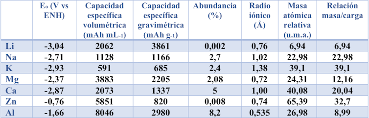 - Iones alcalinos (sodio y potasio). Su mayor peso atómico, potencial algo menos reductor y radio iónico más elevado (ver tabla) podrían limitar la capacidad específica, la densidad de energía, el rendimiento durante el proceso de carga y descarga o incluso la vida útil de la batería, debido a una pérdida continua de la capacidad.