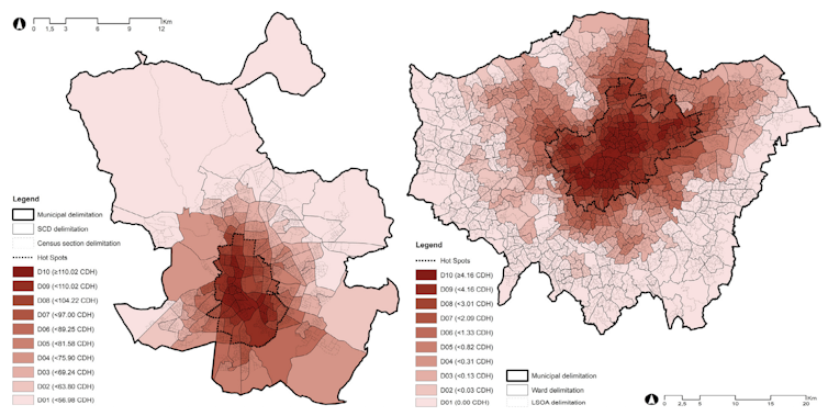 Ambas ciudades, Madrid y Londres, cuentan con una intensa isla de calor, lo que produce un incremento de las temperaturas en el centro de las ciudades con respecto a las zonas más periféricas. Estas diferencias provocan un mayor riesgo de sufrir problemas de sobrecalentamiento en el interior de las viviendas en las áreas urbanas centrales.