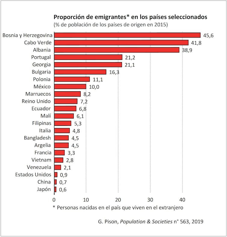 En valores porcentuales, Bosnia-Herzegovina ostenta un récord: hay un ciudadano bosnioherzegovino que vive en el extranjero por cada dos que viven en el país, lo que significa que la tercera parte de las personas nacidas en Bosnia y Herzegovina han emigrado (véase la figura siguiente). Albania está en una situación similar, al igual que Cabo Verde, país insular con escasos recursos.