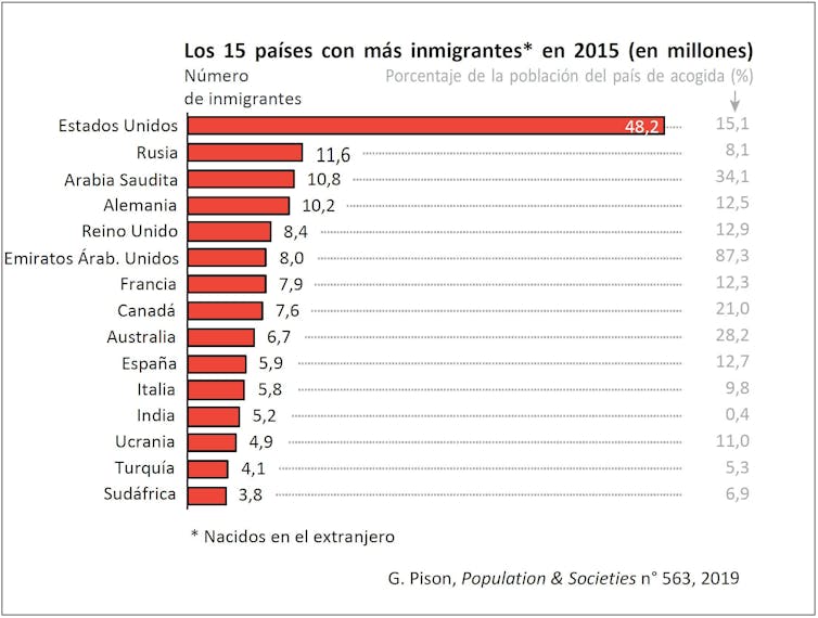 Estados Unidos es el país que tiene en su territorio la mayor cantidad de personas nacidas en el extranjero del mundo: 48 millones en 2015, según datos de las Naciones Unidas. Esta cifra es casi 5 veces superior a la de Arabia Saudita (11 millones) y 6 veces superior a la de Canadá (7,6 millones) (véase la siguiente figura). Sin embargo, en relación a su tamaño, la cantidad proporcional de inmigrantes en estos dos últimos países es mucho mayor: el 34% y el 21%, respectivamente, frente al 15% en los Estados Unidos.