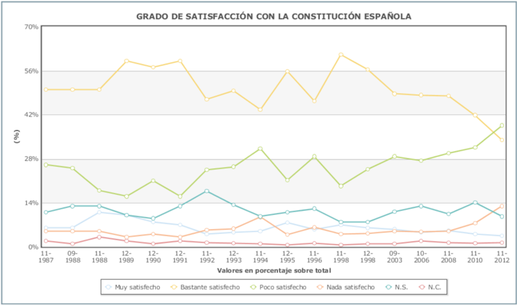 En los años 90 la satisfacción de los ciudadanos con la Constitución rondaba el 65%, sin embargo este índice descendió al 37% la última vez que el CIS preguntó por esta cuestión (noviembre de 2012), puede verse la Serie A. 1.0.02.005
