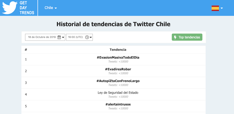 ¿Qué sucedió entre el lunes 14 de octubre, cuando un grupo de estudiantes de secundaria comenzó a evadir el pago del pasaje en algunas estaciones de metro en la capital, y el lunes 21, cuando las autoridades decidieron decretar toque de queda con el ejército en la calle en 9 de las 16 regiones del país tras un saldo de 11 muertos y más de 2 mil detenidos? Parte de la respuesta puede estar, precisamente, en los temas más comentados de las redes sociales.