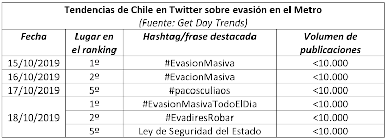 Hasta ese momento solo se trataba de publicaciones que eran tendencia en Chile, pues únicamente consistía en un problema que afectaba a la Región Metropolitana con especial énfasis a su capital Santiago. Es decir, que en cuatro días se detectaron cerca de 60 mil publicaciones asociadas a la evasión en el metro capitalino, la mayoría de ellas contrarias al alza en el precio y con 4 de 6 hashtags que entregaban una especie de aceptación social al acto de no pagar el transporte público como respuesta a la segunda alza del año.