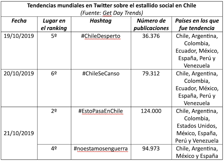 Durante la jornada del sábado 19 de octubre el problema del transporte público en Santiago se transformó en un estallido social con manifestaciones en diversas ciudades a lo largo del país. Mediante el estudio de tendencias mundiales en Twitter entre el sábado 19 y el lunes 21 se detectó que el número de publicaciones asociadas aumentó sustancialmente y los hashtags asociados se convirtieron en tendencias mundiales, así en el transcurso de 72 horas hubo más de 330 mil tuits.