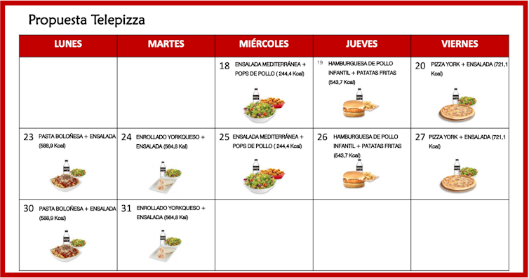 En lo que respecta al menú proporcionado por Telepizza, no hay mucho que explicar. Es fast food, porque una ensalada en el menú no es suficiente para contrarrestar el desequilibrio dietético que genera esta manera de alimentarse.