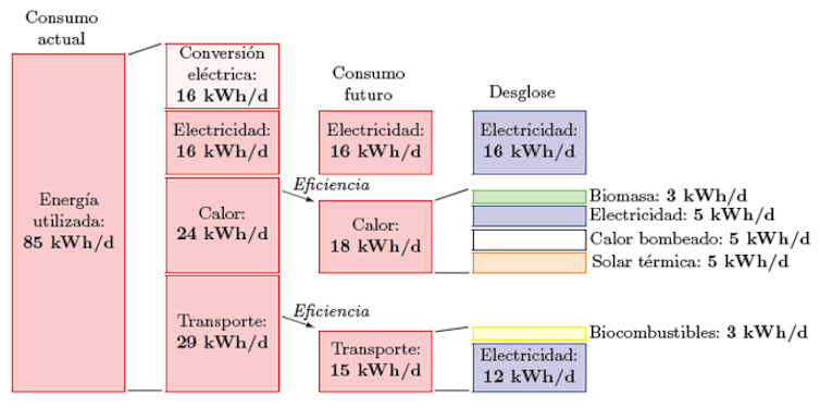 Si, además, dejamos de generar electricidad mediante centrales que queman combustibles fósiles con eficiencias inferiores al 50 %, y las sustituimos por energías renovables, podemos reducir nuestro consumo energético actual de 85 kWh por persona y día a 49 kWh por persona y día. ¡Muy buenas noticias!