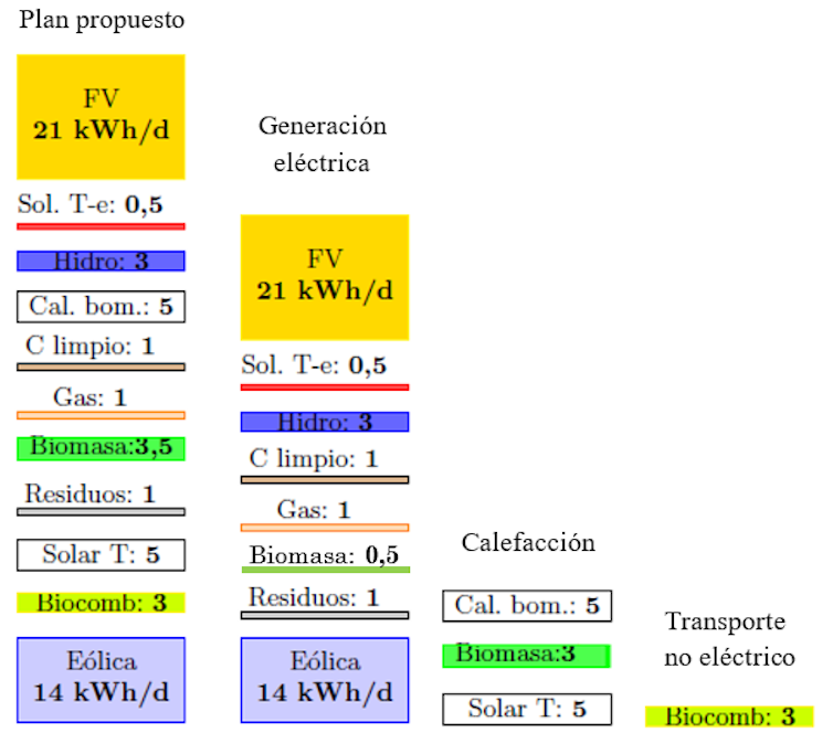 Según este plan, son necesarios 14 kWh/p/d de eólica y 21 kWh/p/d de fotovoltaica.