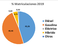 La figura 1 refleja las tasas de matriculación de vehículos en España en 2019. Los eléctricos han representado el 0,6% del total y los híbridos (equipados con un motor de combustión y otro eléctrico) el 4,75%.