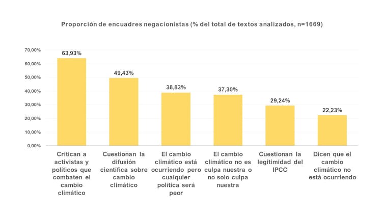 Pese a la existencia de un consenso científico casi total en torno al origen humano del calentamiento global, un 37,30% de los textos de estos think tanks defienden lo contrario, apuntan a otras causas o relativizan el problema. Además, un 29,24% pone en entredicho la legitimidad del IPCC.