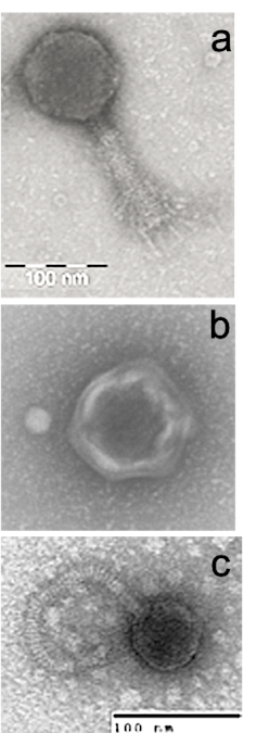 La mayoría de los virus marinos tienen doble cadena de ADN y pertenecen a tres familias, que se clasifican en: Myoviridae, con cola larga y contráctil; Syphoviridae, con cola curvada y no contráctil y Podoviridae, de cola muy corta y no contráctil.