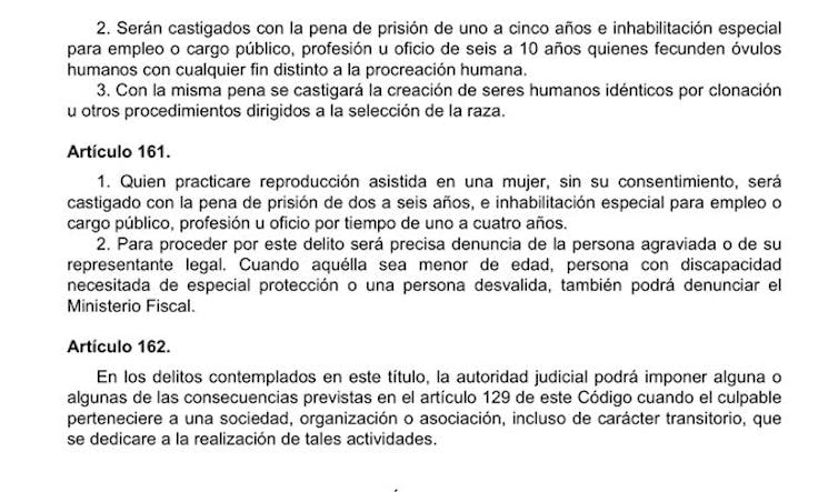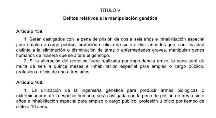 En España, si algún investigador hubiera tenido la tentación de abordar un experimento similar se hubiera enfrentado también a penas de cárcel y de inhabilitación. En nuestro Código Penal actual encontramos los artículos del 159 al 162, incluidos dentro del título V, Delitos relativos a la manipulación genética, introducidos en el Código Penal de 1995 y modificados el 160, 161 y 162 en la LO 15/2003, de 25 de noviembre. Adjunto su redactado actual (última versión 4 de marzo de 2019) en esta imagen: