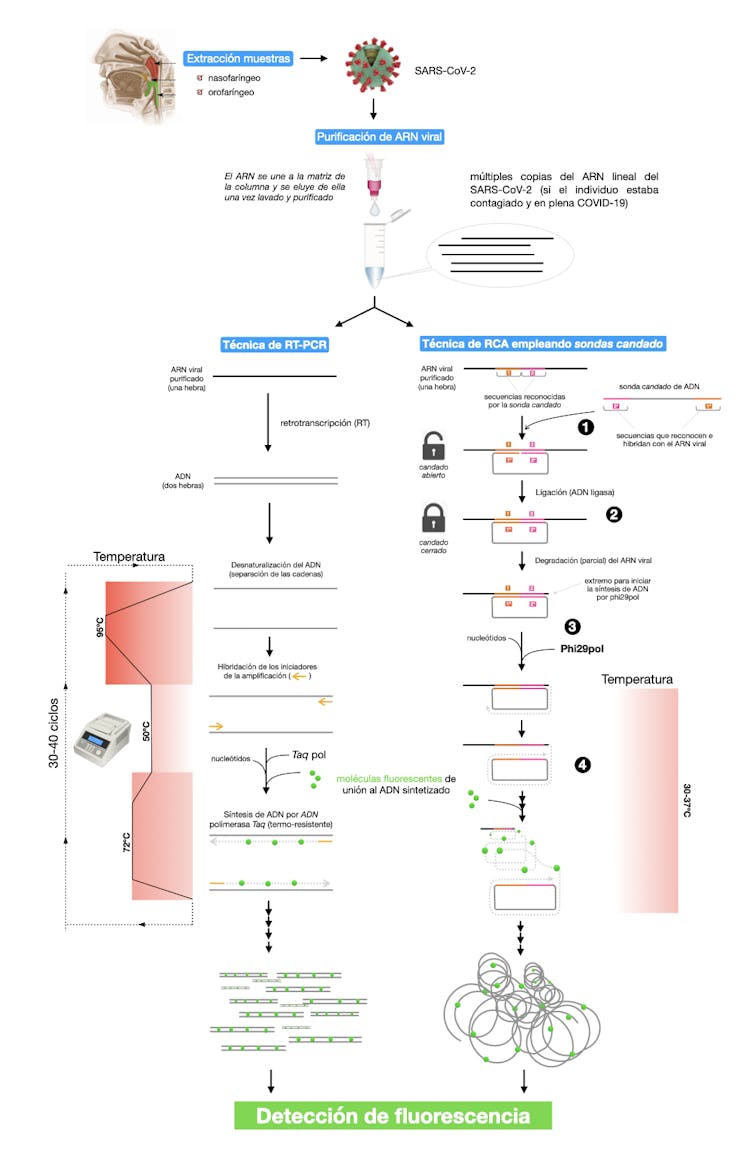 Pero, ¿cómo se convierte el ARN del SARS-CoV-2 en una molécula de ADN circular? Gracias a la capacidad de las moléculas de ácidos nucleicos de formar híbridos entre sí cuando sus secuencias de nucleótidos son complementarias y al uso de pequeñas moléculas de ADN llamadas sondas candado (del inglés padlock probes). Estas sondas son un recurso molecular de amplificación de ADN ideado en el pasado para identificar determinados patógenos, incluidos algunos virus.