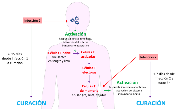 En este caso, el proceso de eliminación del patógeno, si el organismo tiene buena memoria de una infección anterior, es mucho más rápido y suele durar como mucho siete días (frente a 14 en el primer «ataque»). La razón es que ya no se necesita comenzar por la respuesta innata. Además, las células T de memoria no necesitan pasar por los nódulos linfáticos ni por el bazo, sino que pueden responder de inmediato. Por eso, una vacuna ideal debería generar células T de memoria, además de anticuerpos.