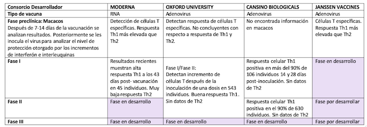Las vacunas serán más efectivas si, además de provocar la fabricación de anticuerpos (respuesta humoral), son capaces de aumentar los niveles de nuestras células T que desarrollan memoria (respuesta celular). En la tabla siguiente se detalla la detección de las células T en los ensayos en fase preclínica (macacos) y en las sucesivas fases clínicas de las vacunas en desarrollo contra COVID-19.