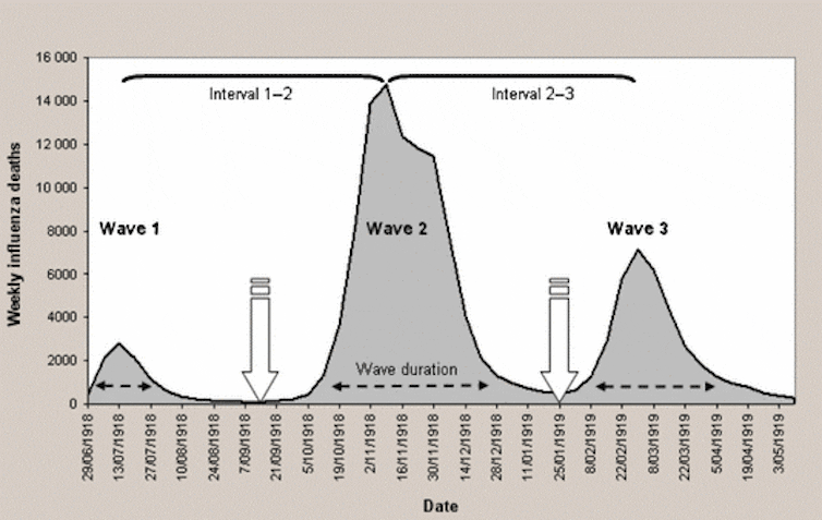 En el caso de SARS-CoV-2 también se puede apreciar una dinámica similar, aunque la amplitud de los picos sea distinta por las medidas de control de que disponemos hoy, muy diferentes de las de hace 100 años.