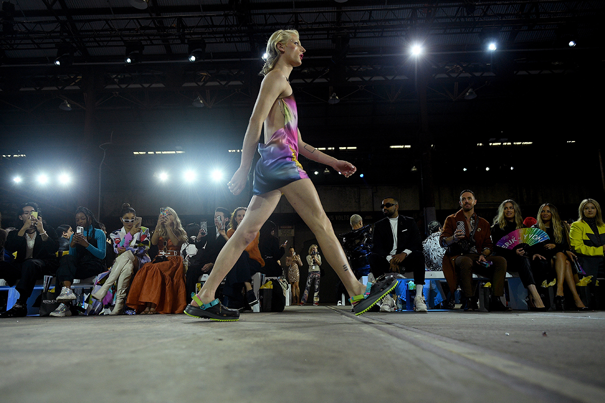 Segundo día consecutivo de la Semana de la Moda en Australia, modelo desfila luciendo una creación de Erik-Yvon.