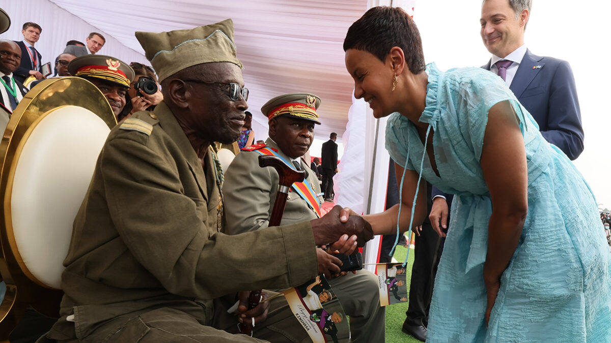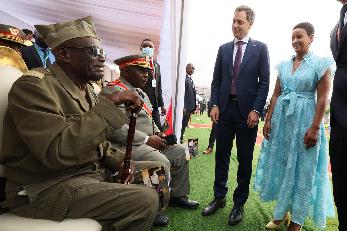 El primer ministro Alexander De Croo y la ministra de Cooperación para el Desarrollo, Meryame Kitir, fotografiados con el caporal Kunyuku en el margen de una ofrenda floral depositada en el ‘Memorial aux anciens combattants’, en Kinshasa, durante una visita oficial de la pareja real belga a la República Democrática del Congo.