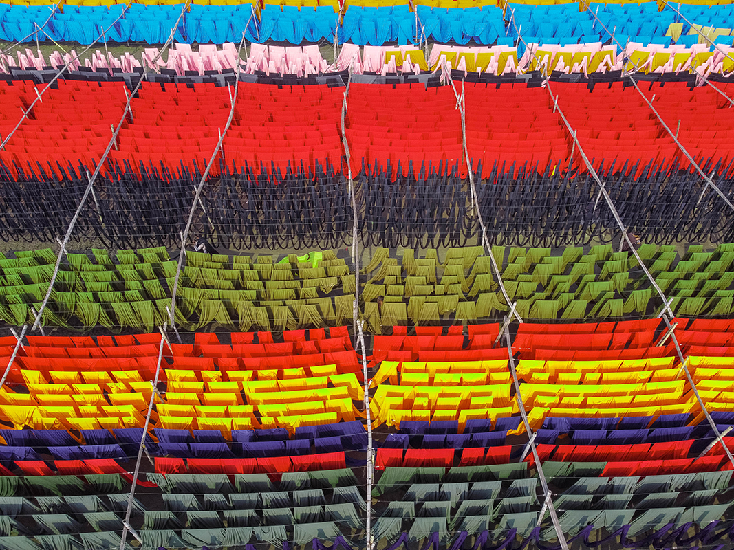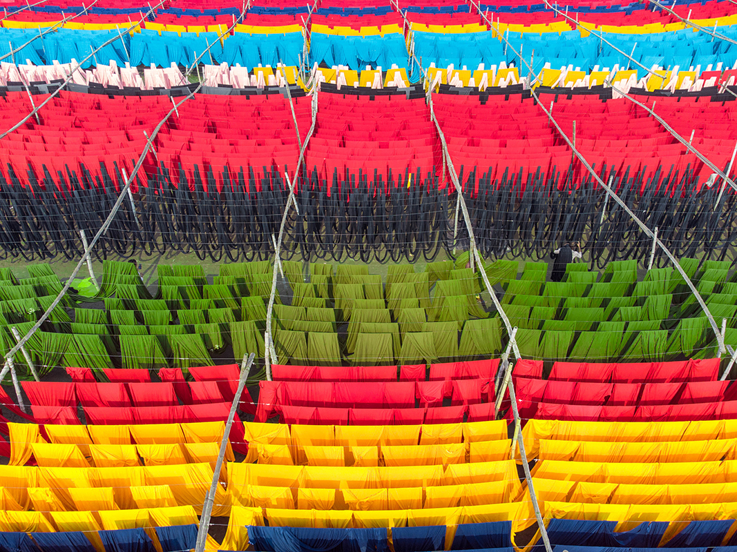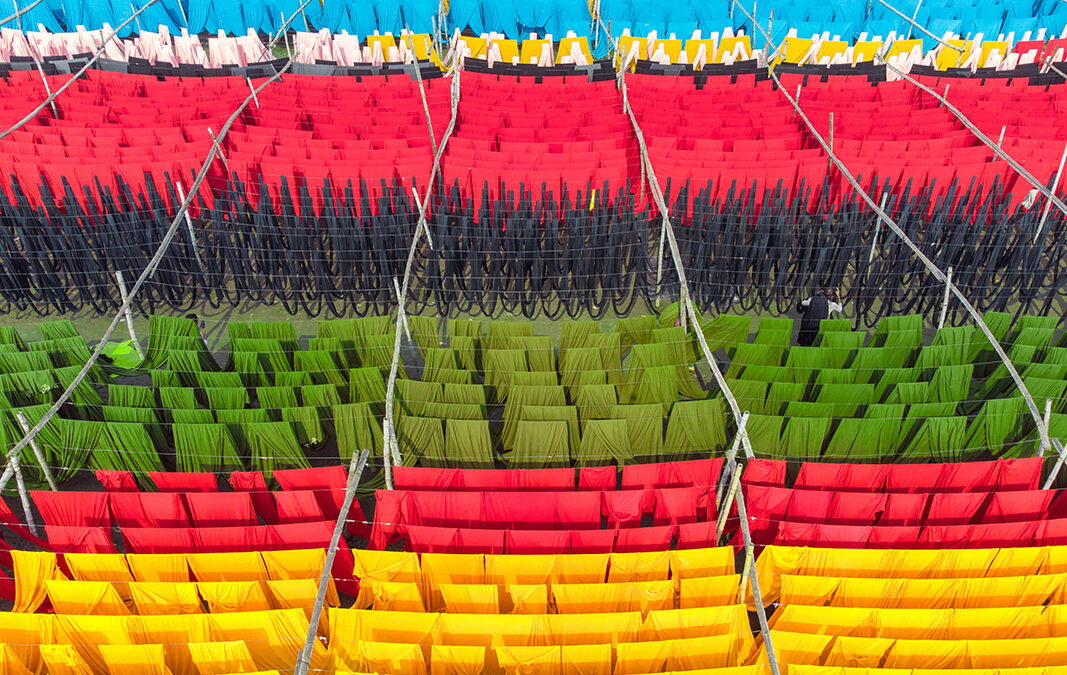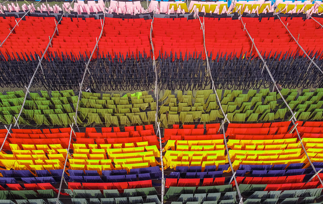 Los trabajadores cuelgan miles de metros de telas de diferentes colores para que se sequen y puedan convertirse en camisetas y chalecos. Los alambres de hierro se utilizan entre estructuras de bambú para crear líneas de lavado gigantes para la parte final del proceso de teñido mientras las telas se secan al sol en Narayanganj, Bangladesh.