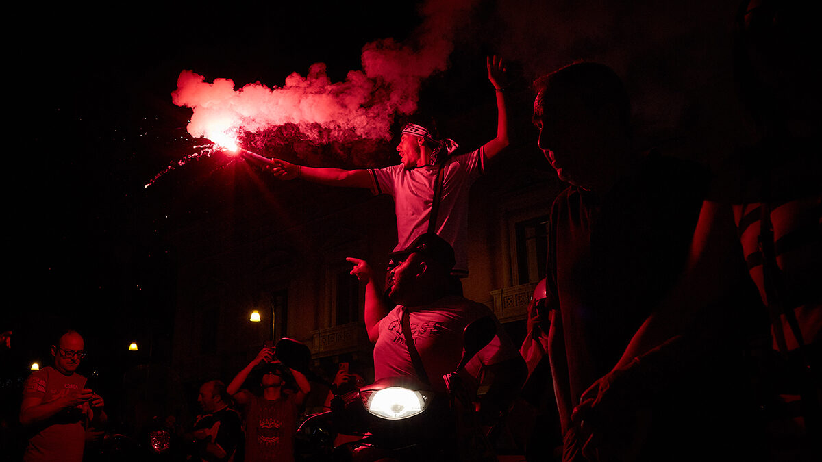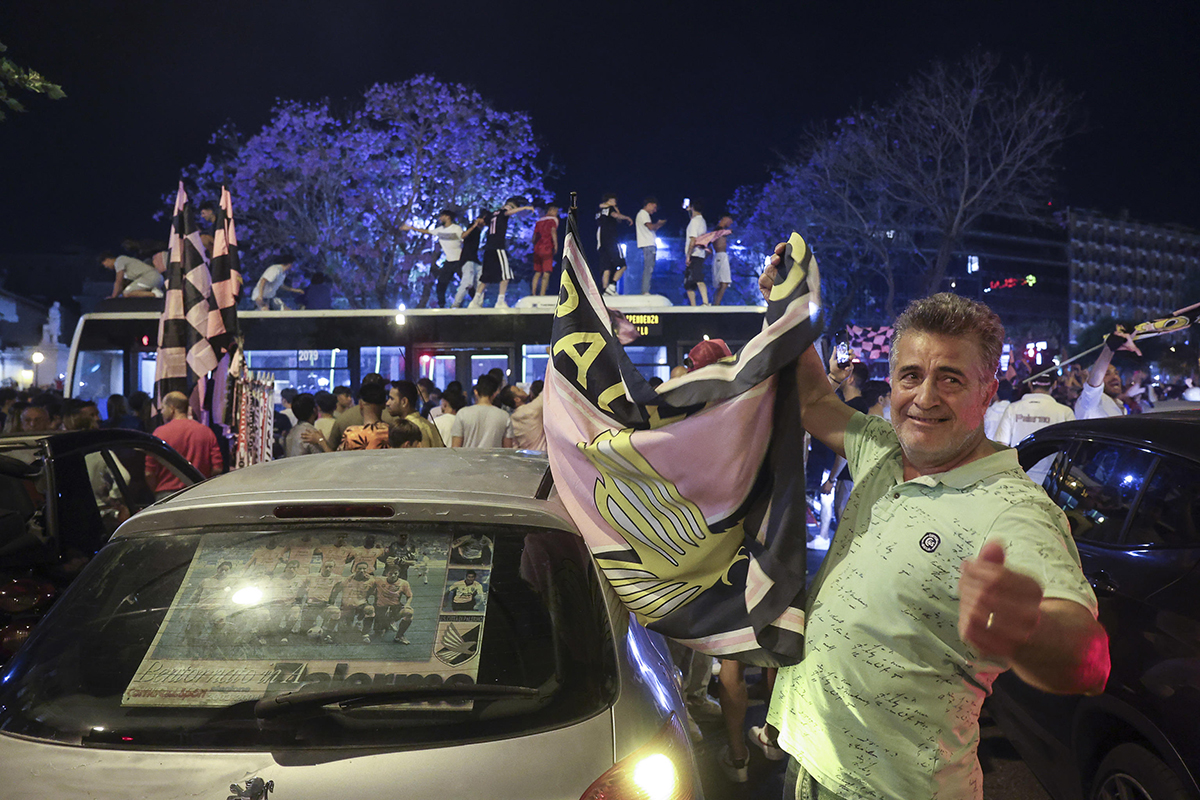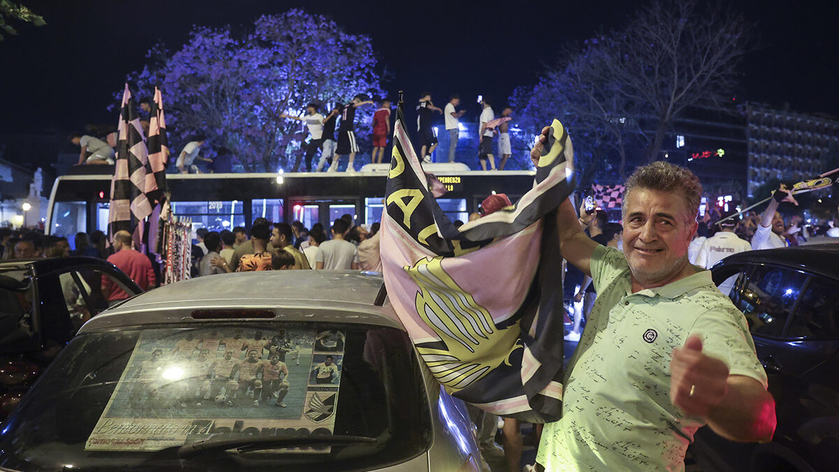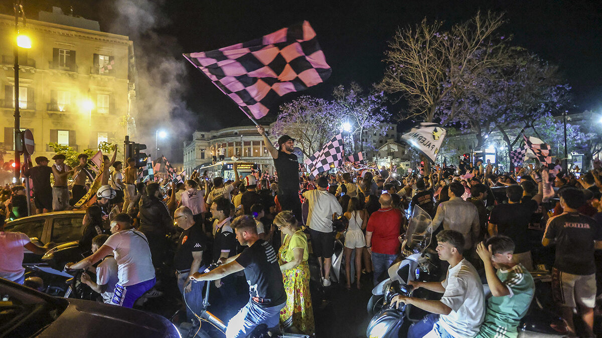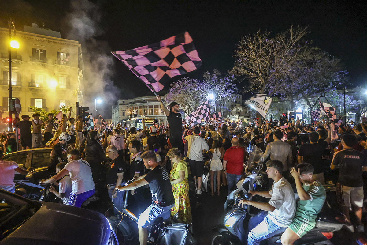 El equipo de fútbol de Palermo gana el último partido y regresa a la competición de la Serie B italiana.Los hinchas salen a las calles a celebrar.