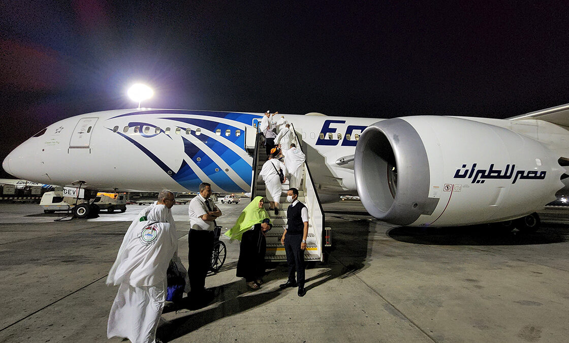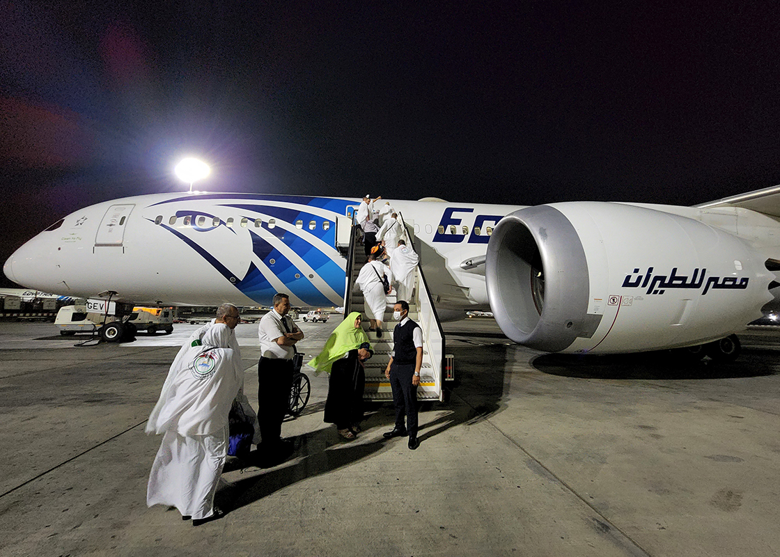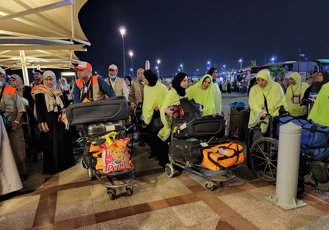 Peregrinos musulmanes palestinos llegando al aeropuerto Internacional del Cairo mientras se preparan para ir de peregrinaje a La Meca