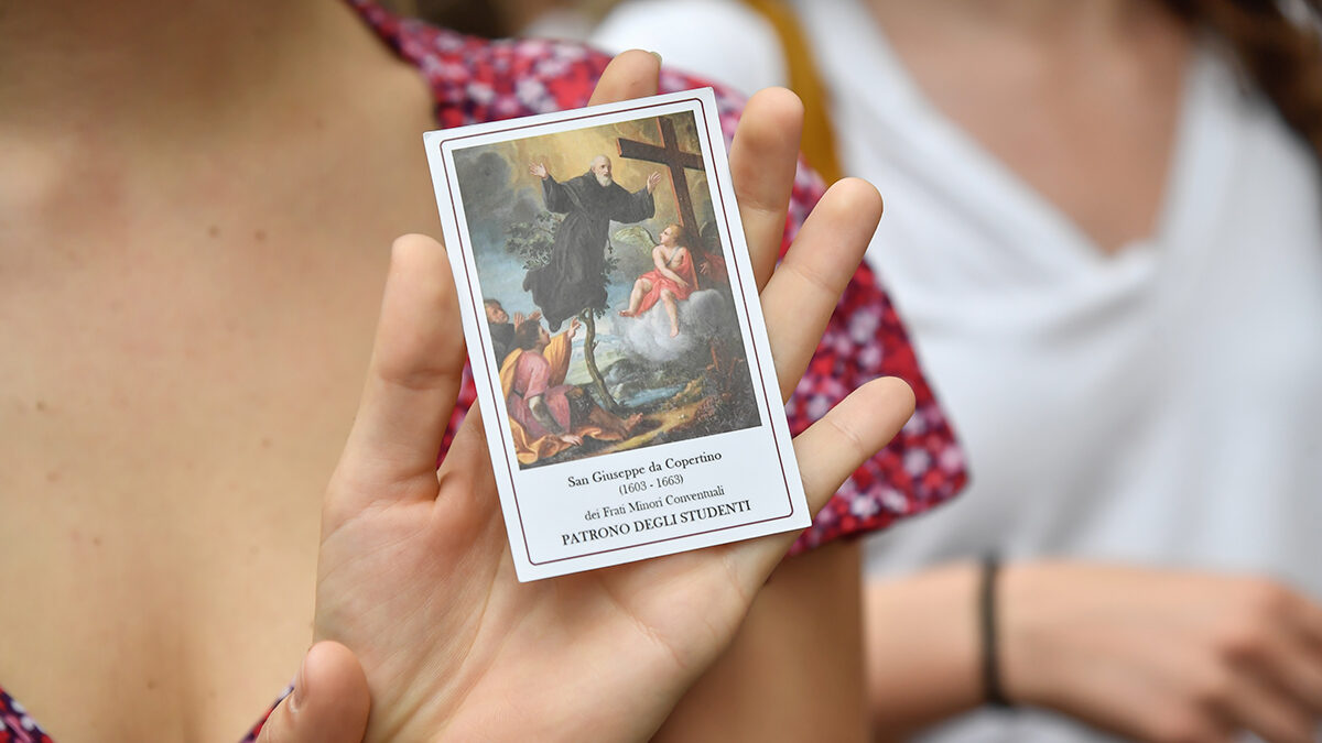 Un estudiante eseñando su estampa de San Giuseppe da Copertino, patrón de los estudiantes.