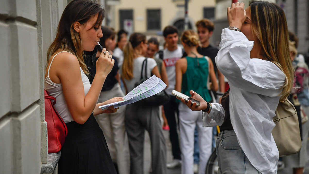 Estudiantes de último año de instituto a punto de entrar a realizar sus exámenes finales frente al Liceo Parini.