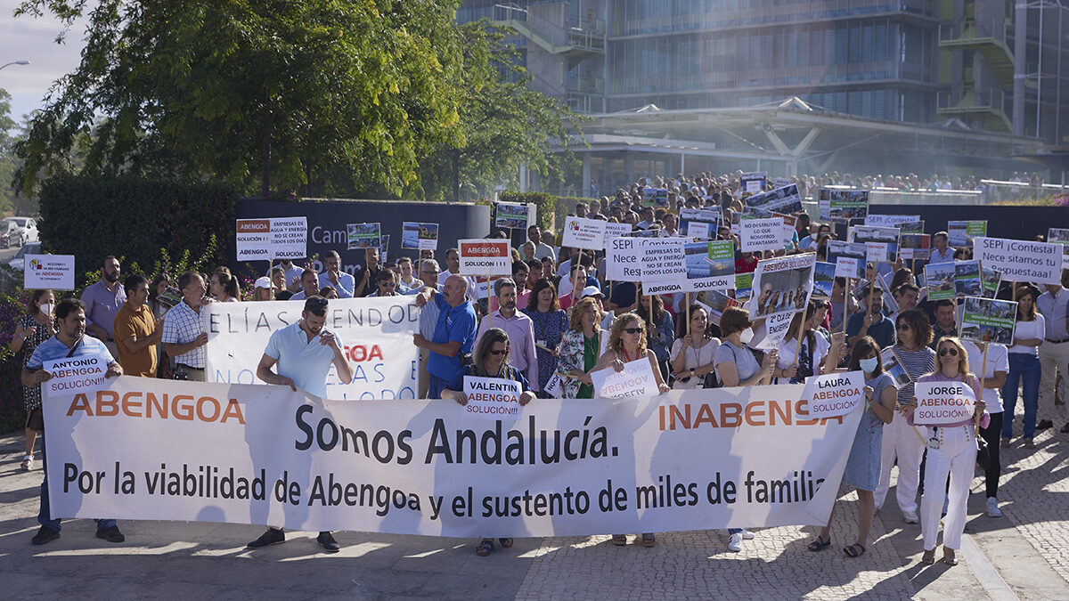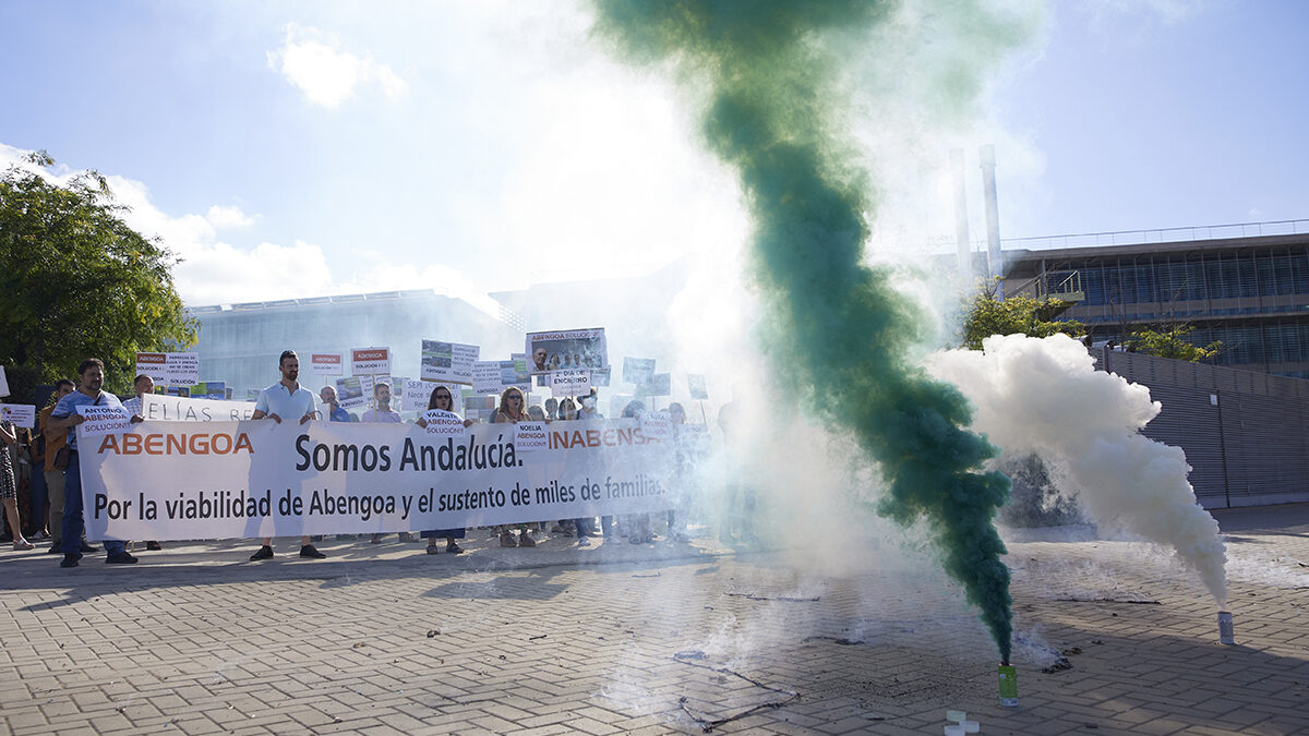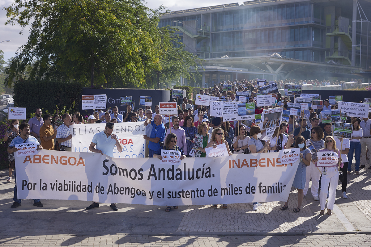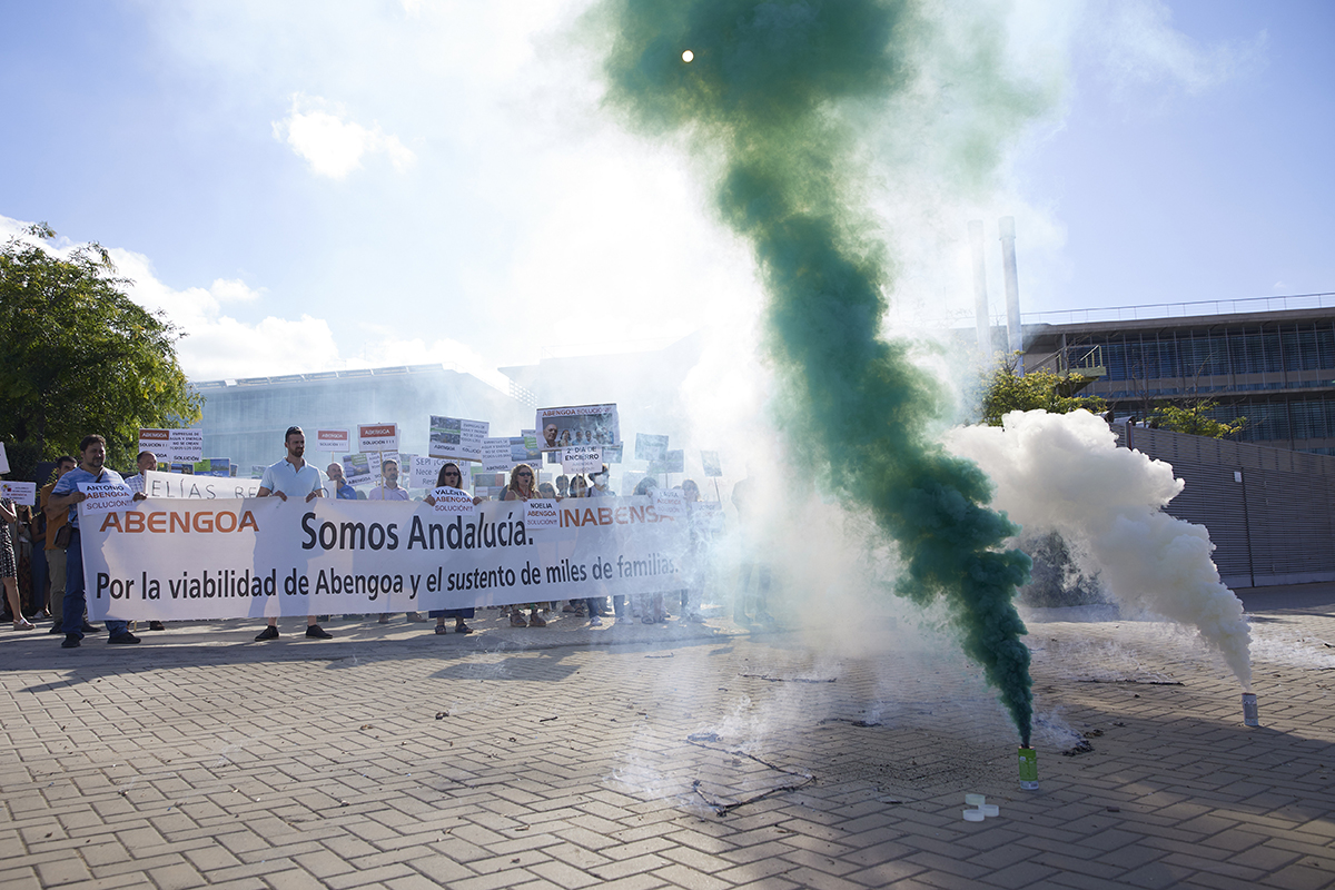 Los trabajadores de Abengoa se concentran a las puertas de la sede en Palmas Altas para el rescate de la empresa sevillana.