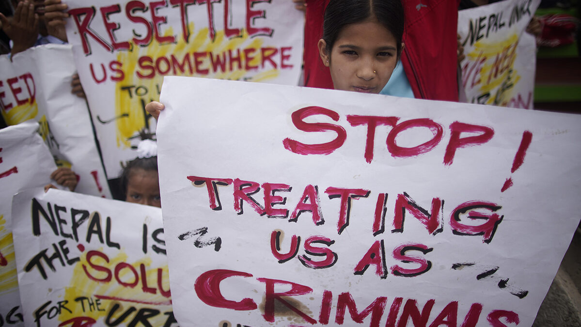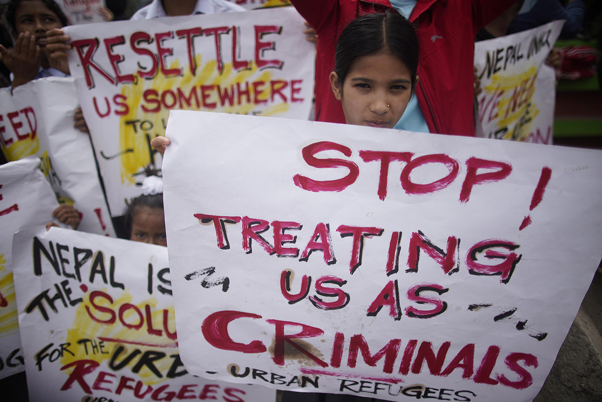 Refugiados rohingya realizan una protesta frente a la oficina de las Naciones Unidas exigiendo derechos fundamentales, necesidades básicas y una solución después de haber sido desplazados de Myanmar en 2015 en Lalitpur.