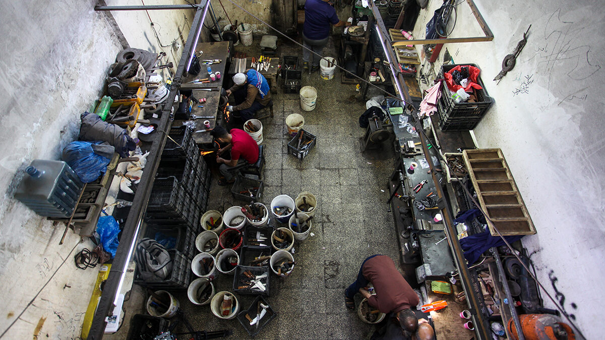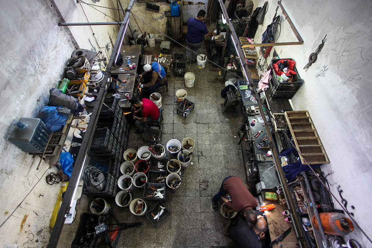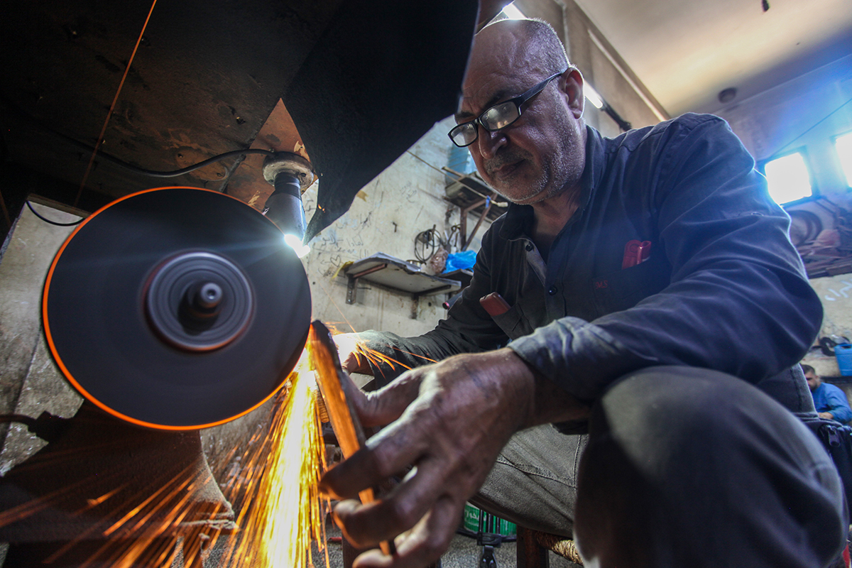Trabajadores palestinos afilan cuchillos en un taller antes de Eid al-Adha en la ciudad de Gaza.