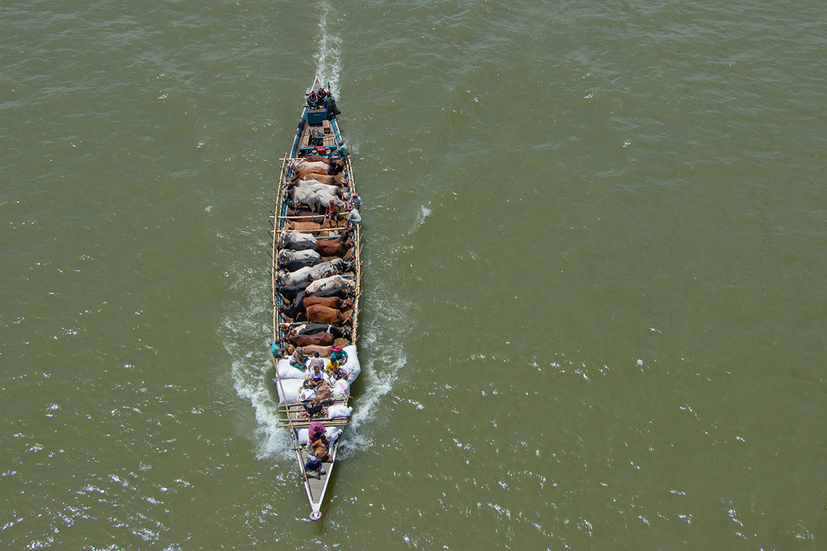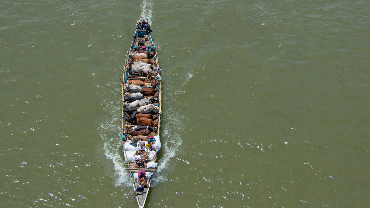 Más de un millón de cabezas de ganado recorren casi 200 millas en los botes pequeños, acompañados por pasajeros humanos, muchos de los cuales se posan en la popa y la popa del barco en su camino hacia el mercado.
