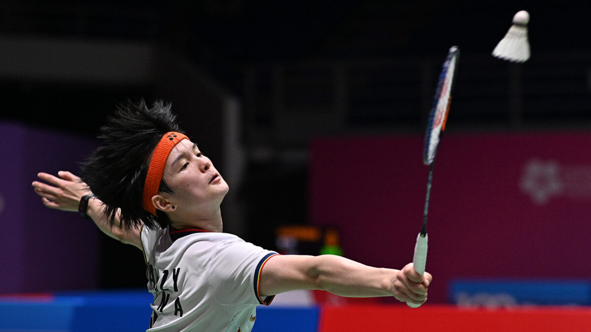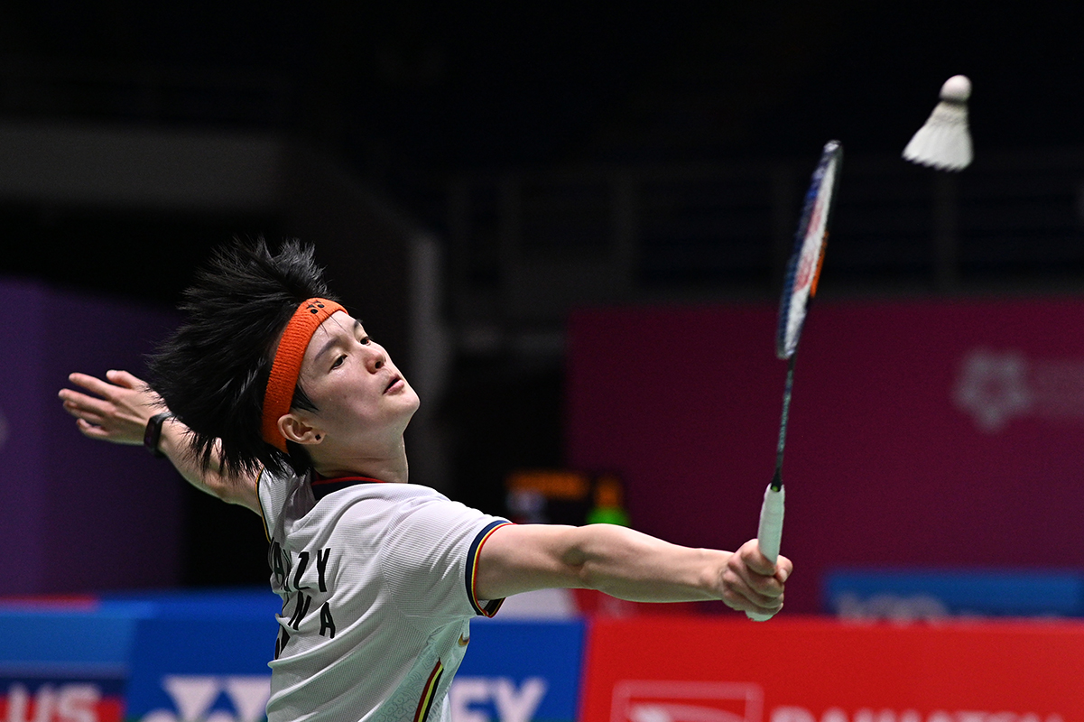 Wang Zhiyi de China regresa durante el partido de octavos de final de individuales femeninos contra Akane Yamaguchi de Japón.