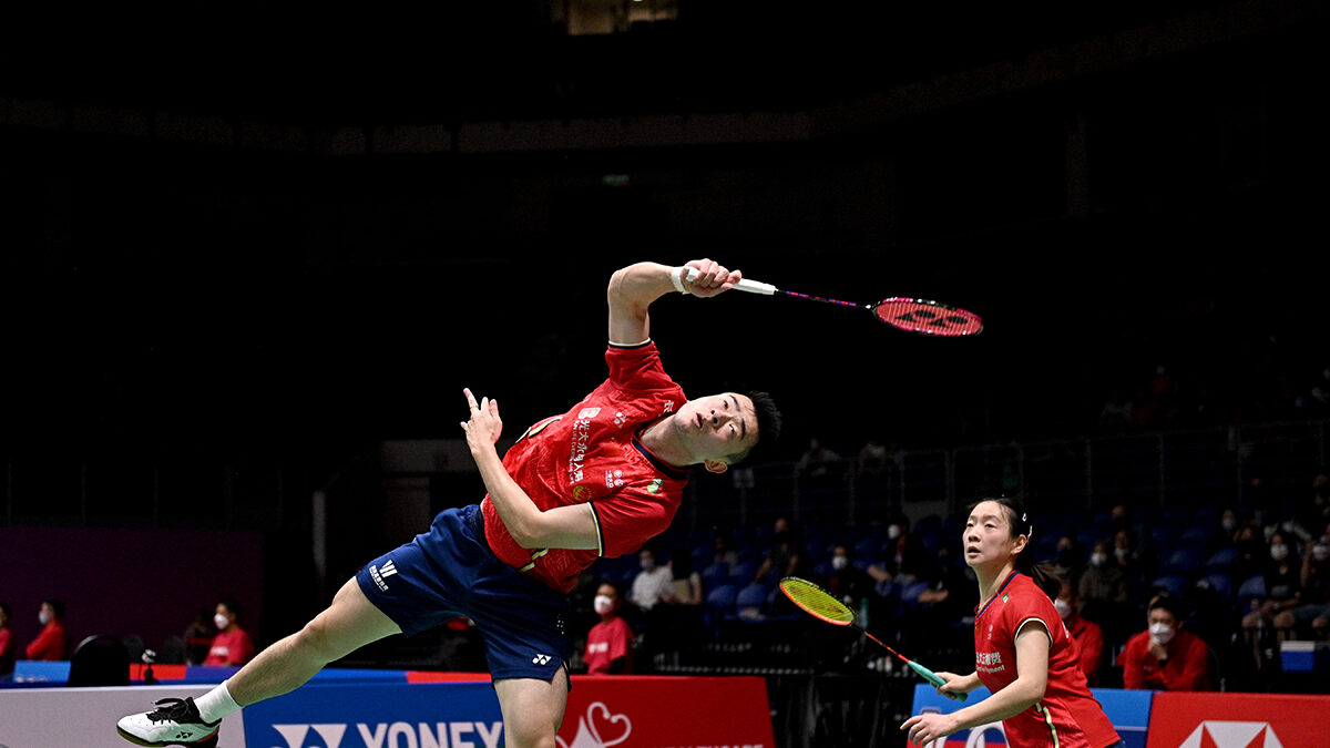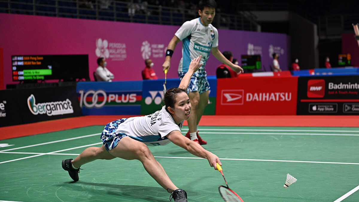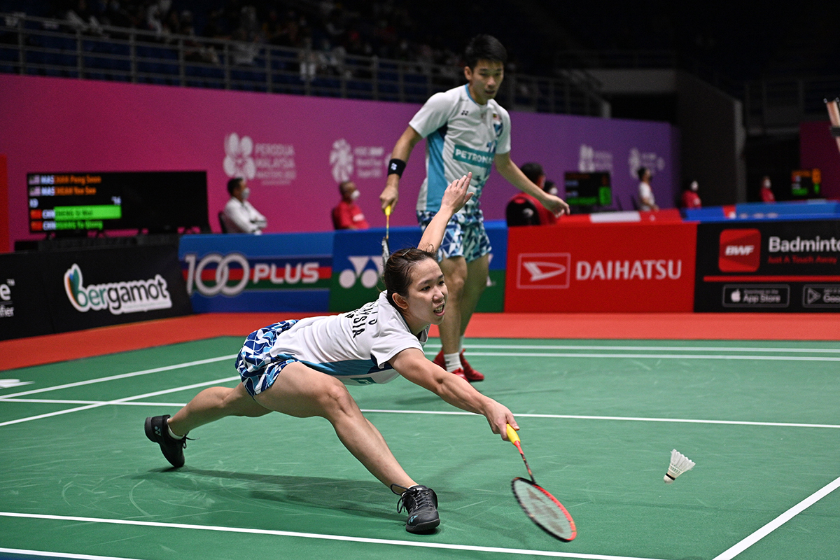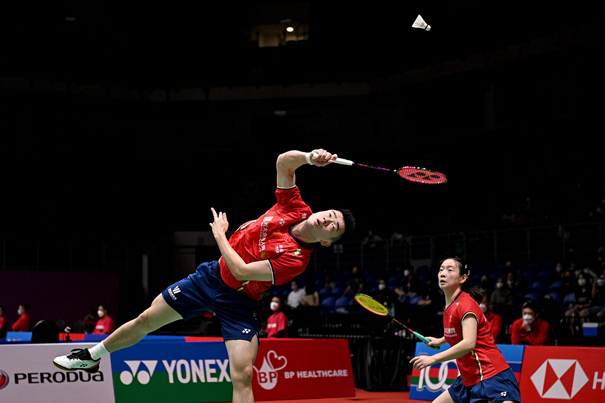 Zheng Siwei y Huang Yaqiong de China compiten durante el partido de octavos de final de dobles mixtos contra Chan Peng Soon y Cheah Yee See de Malasia en el Masters de Malasia 2022.