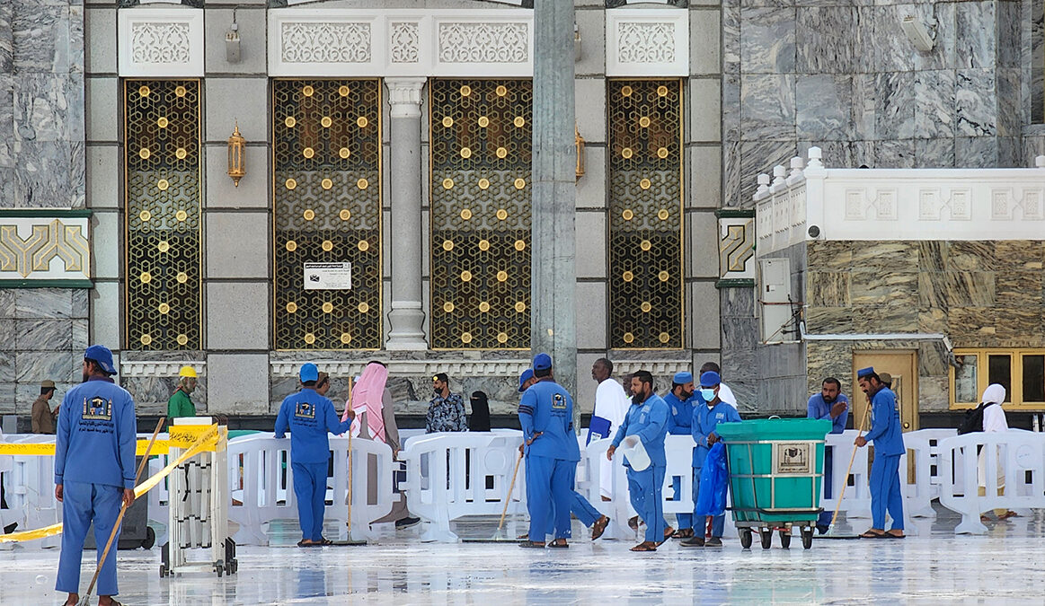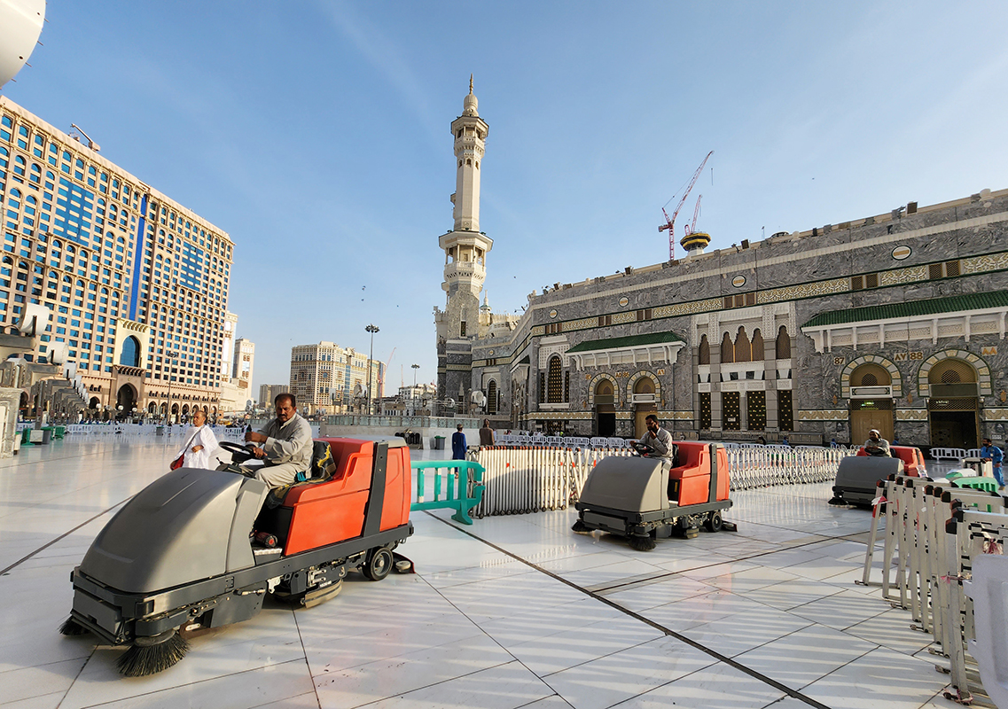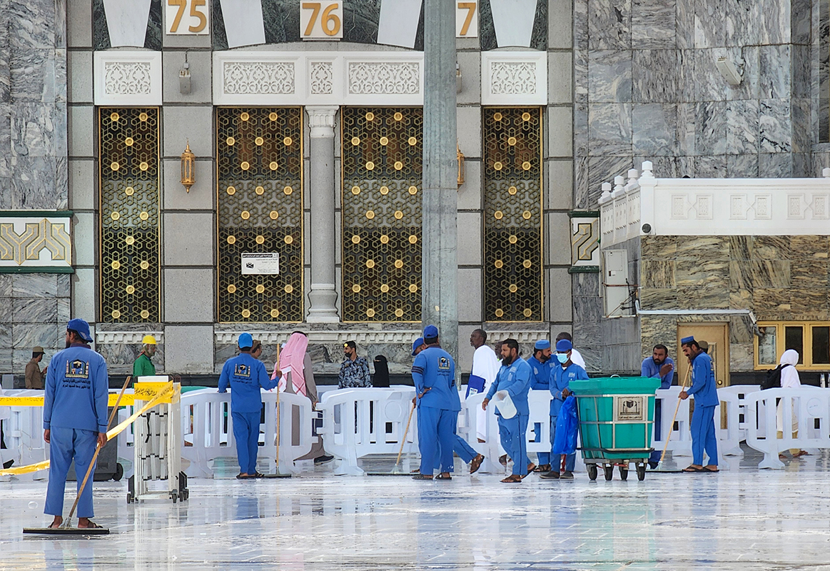 Los limpiadores limpian el suelo de la Kaaba, el santuario más sagrado del Islam, en la Gran Mezquita de la ciudad sagrada saudí de La Meca, durante la peregrinación anual del Hajj.