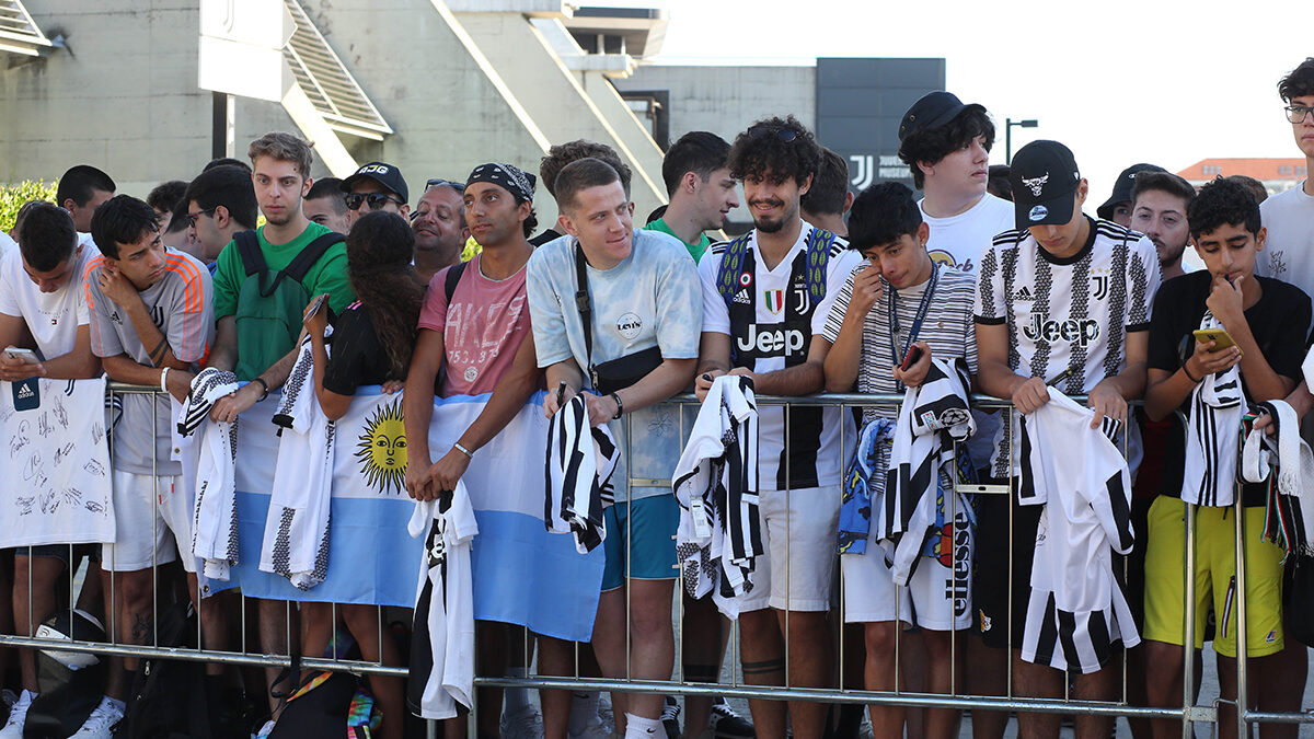 Un gran grupo de aficionados reciben al jugador en las puertas del campos para darle la bienvenida.