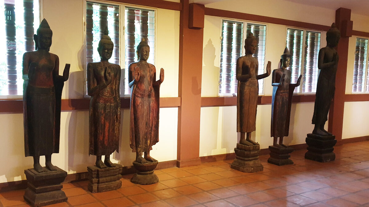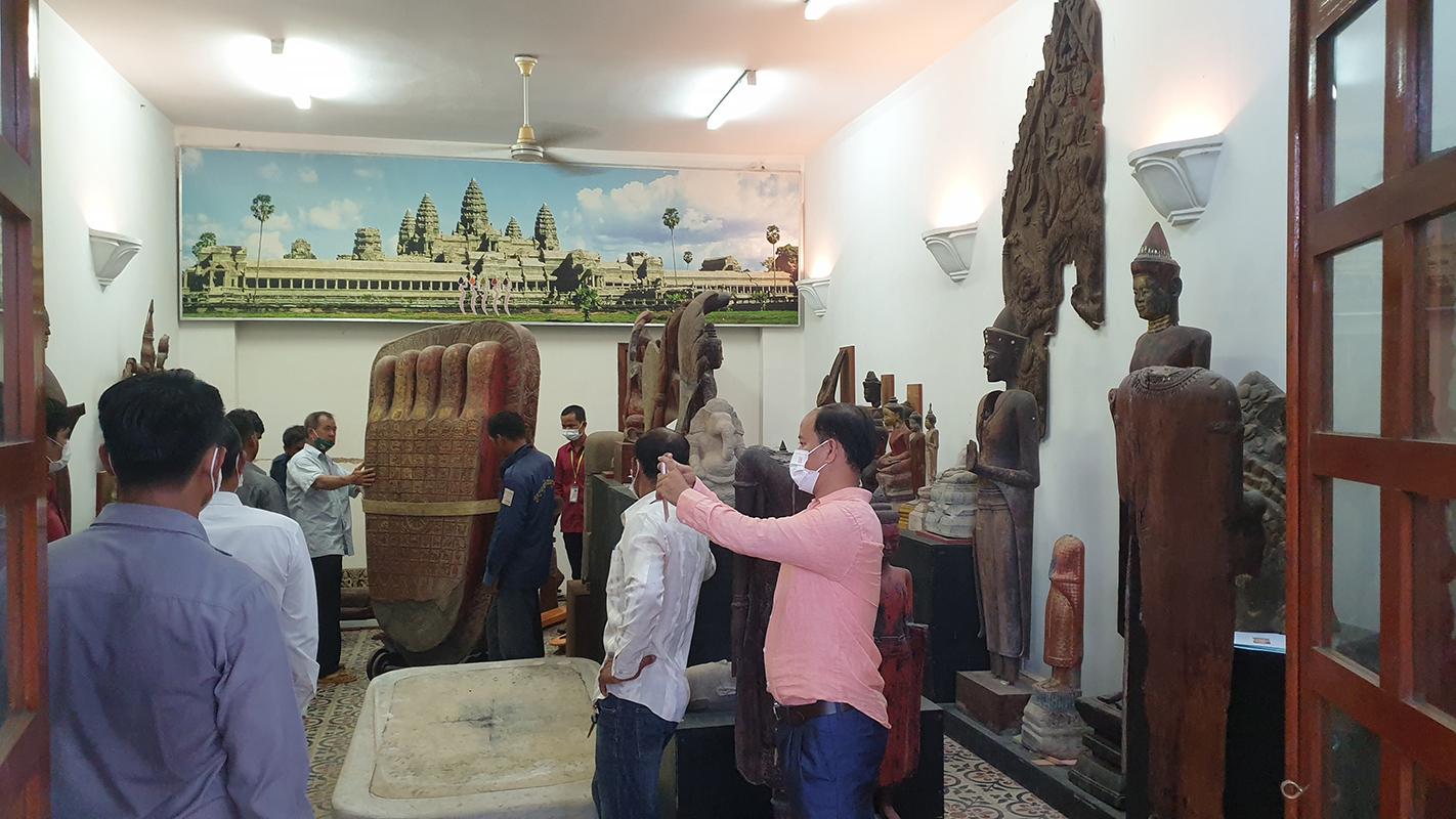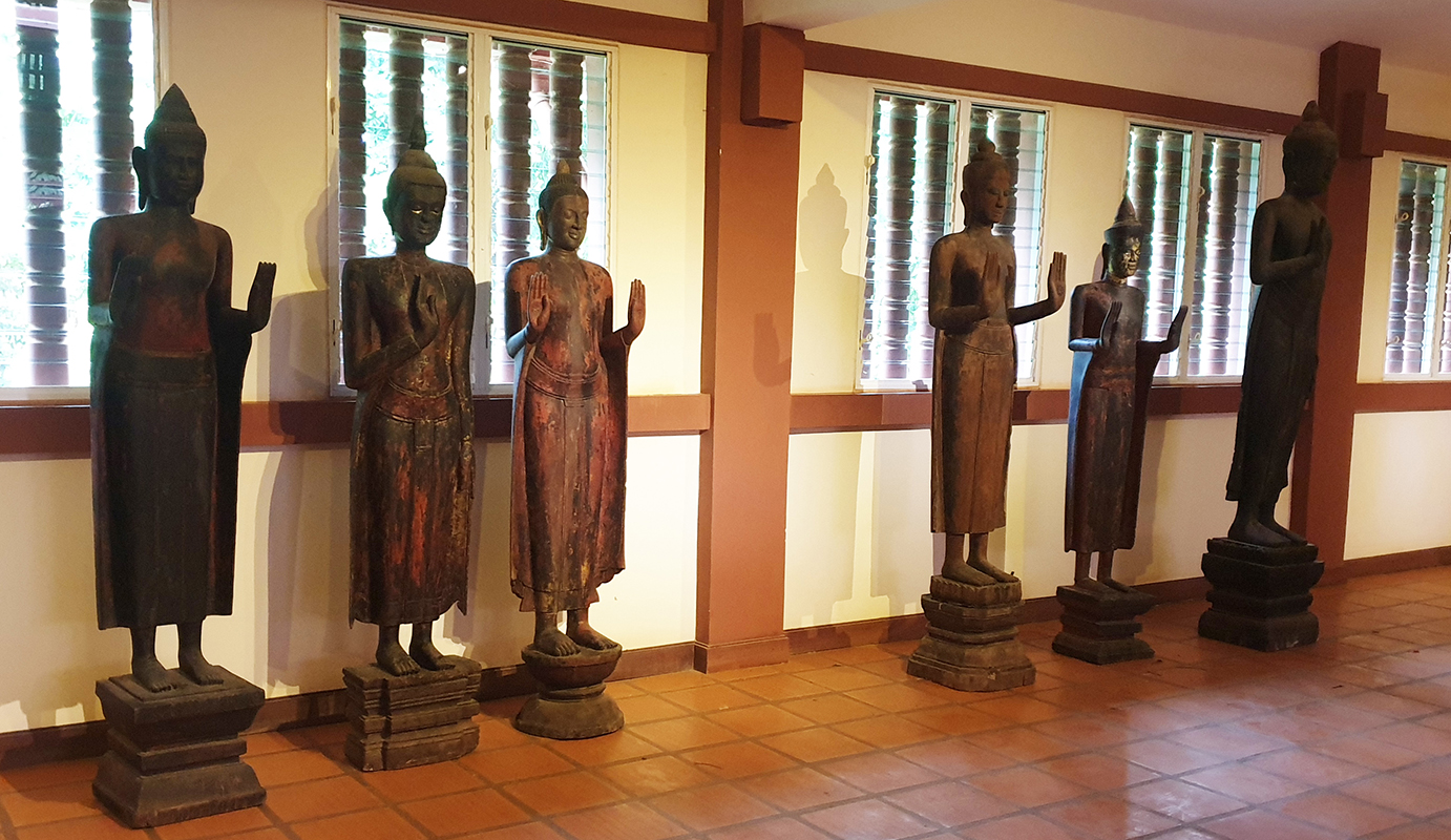 Una estatua de pie de Buda de arenisca restaurada y seis antiguas estatuas de Buda de madera se exhiben en el Museo Preah Norodom Sihanouk-Angkor en la provincia noroccidental de Siem Reap en Camboya.