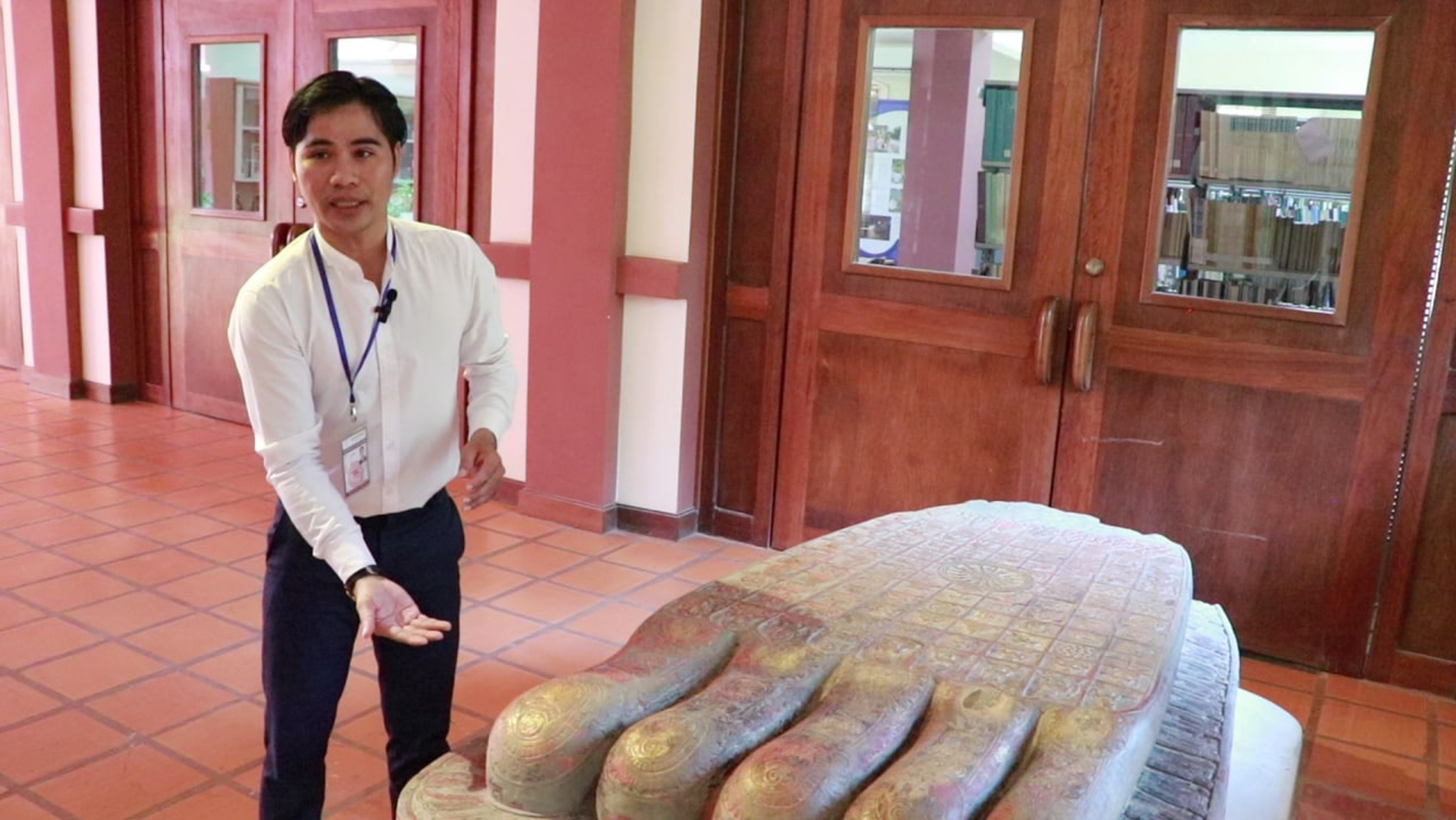 Imágenes que muestran a un miembro del personal presentando una gran estatua de pie de Buda de piedra arenisca en el Museo Preah Norodom Sihanouk-Angkor en la provincia de Siem Reap, Camboya.