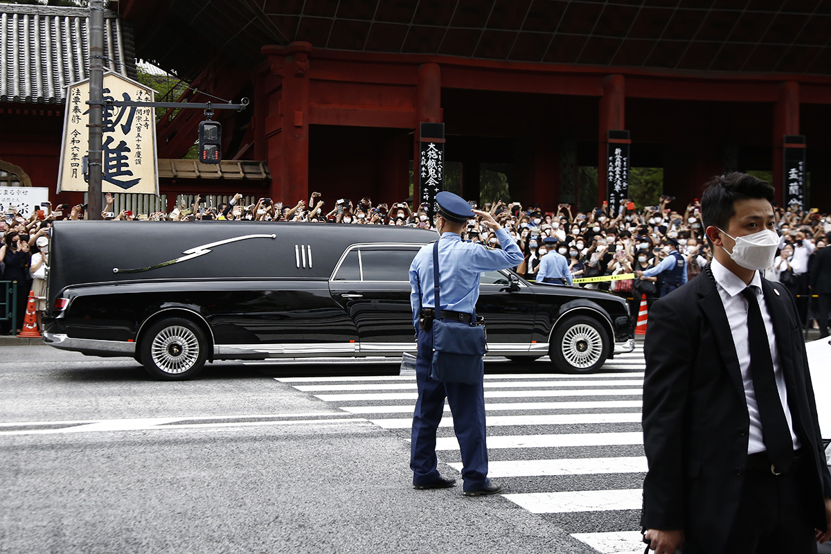 El coche fúnebre con el cuerpo del ex primer ministro Shinzo Abe sale del templo Zojoji en Tokio.