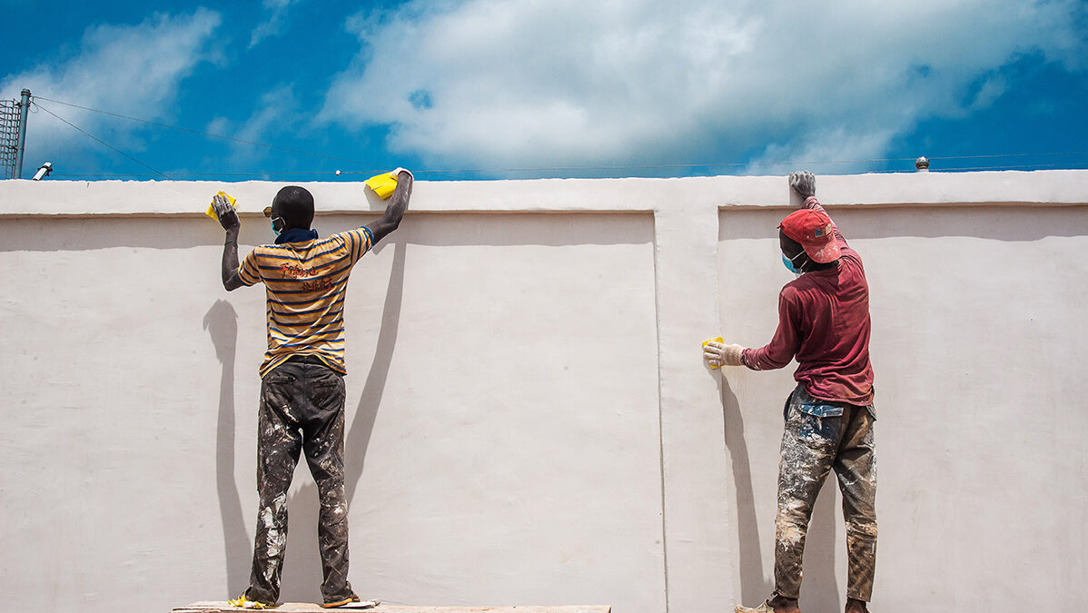 Imágenes de los trabajadores pintan la pared de la planta de energía fotovoltaica de Sakai en Bimbo, cerca de Bangui, en la República Centroafricana.