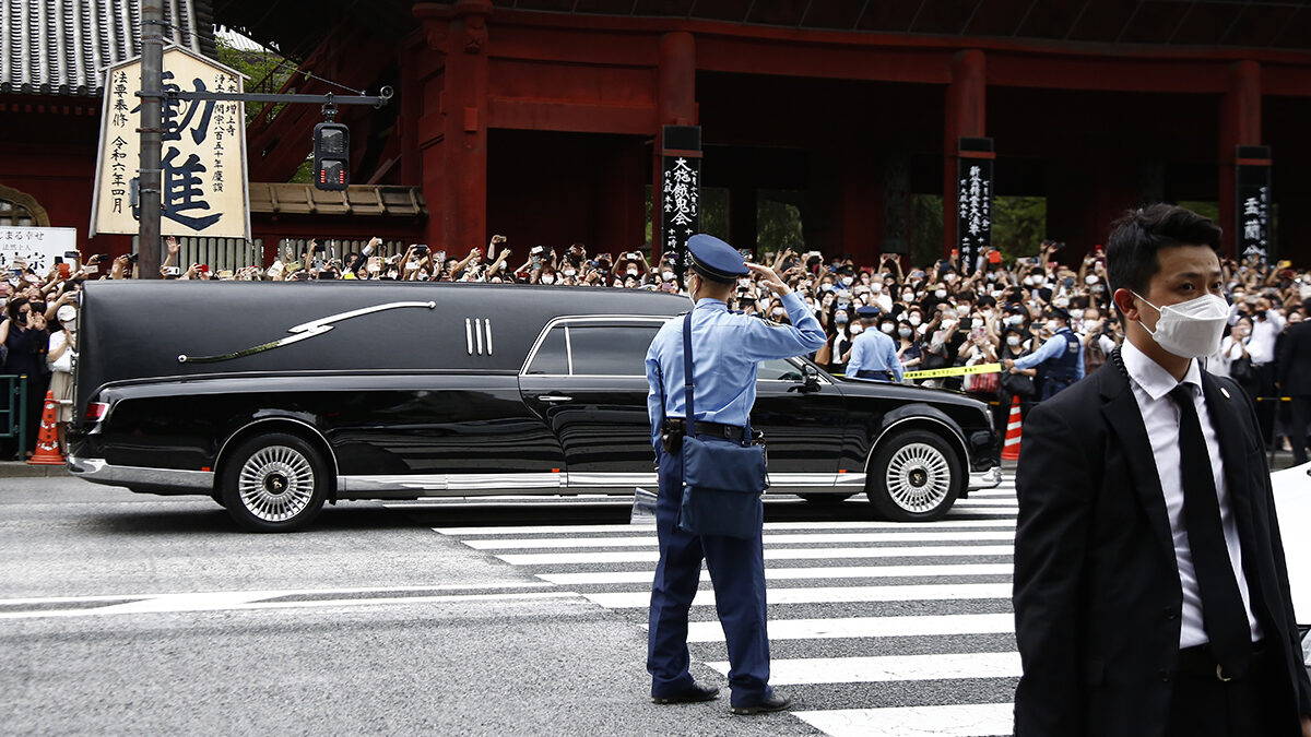 El coche fúnebre con el cuerpo del ex primer ministro Shinzo Abe sale del templo Zojoji en Tokio.