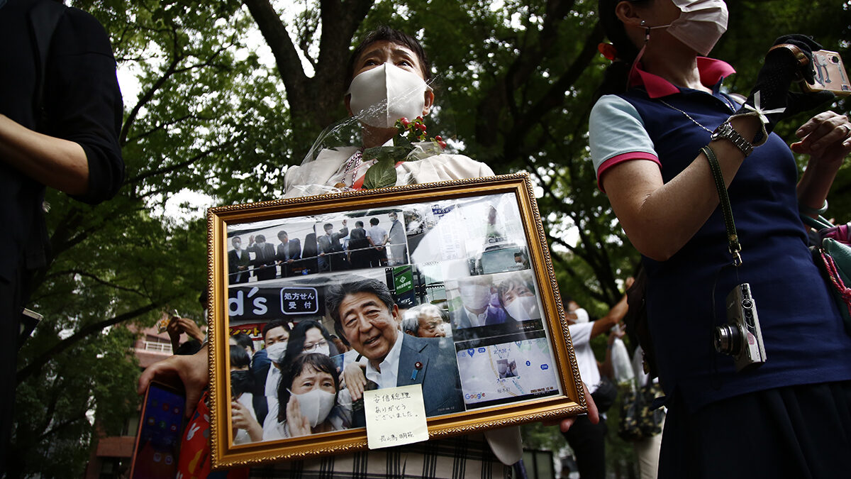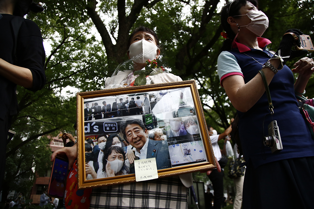 Una mujer sostiene sus fotografías conmemorativas con el ex primer ministro Shinzo Abe mientras el coche fúnebre sale del Templo Zojoji en Tokio.