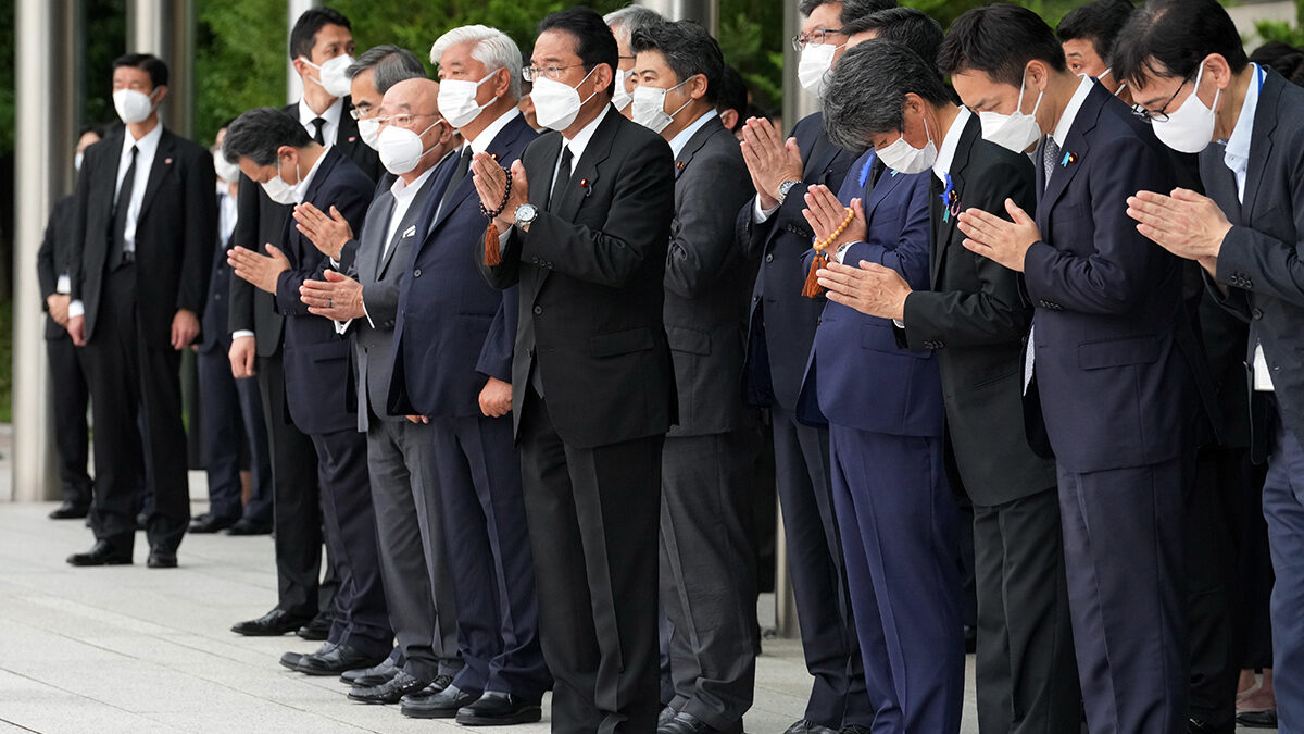 El primer ministro de Japón, Fumio Kishida, funcionarios y empleados ofrecen oraciones hacia un coche fúnebre que lleva el cuerpo del ex primer ministro Shinzo Abe, que realiza una breve visita a la oficina del primer ministro.