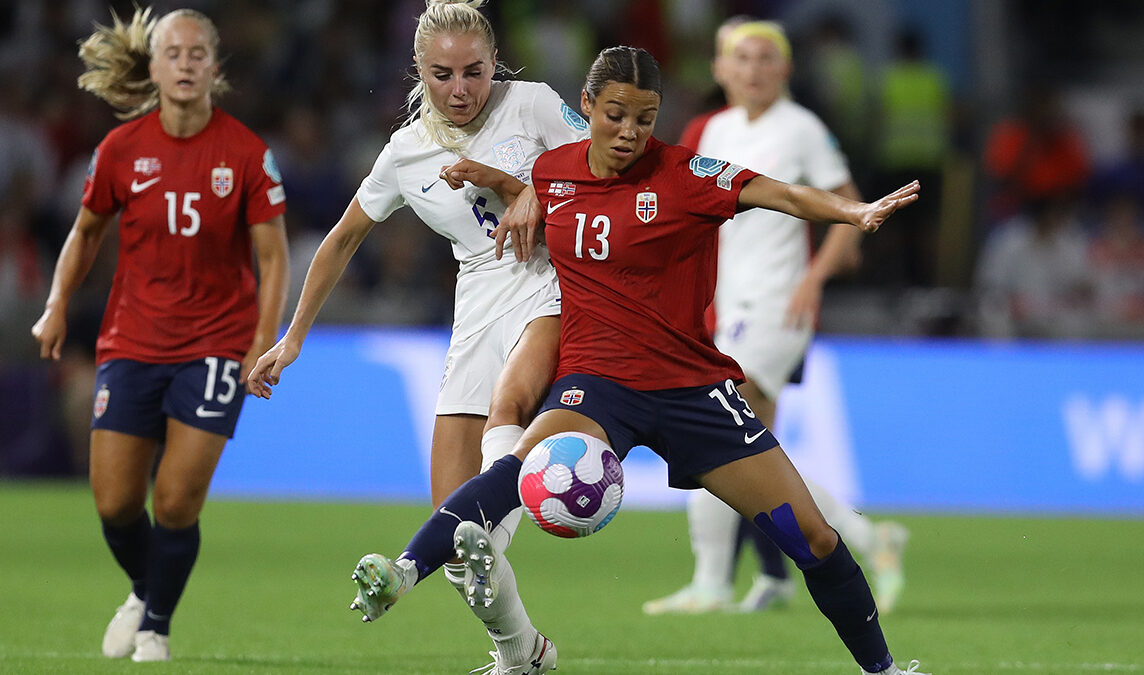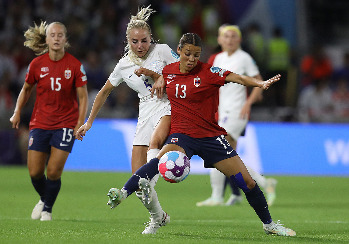 Alex Greenwood de Inglaterra y Celin Bizet Ildhusoy de Noruega peleando el balón durante el partido del Campeonato Europeo Femenino de la UEFA 2022 en el Estadio AMEX.