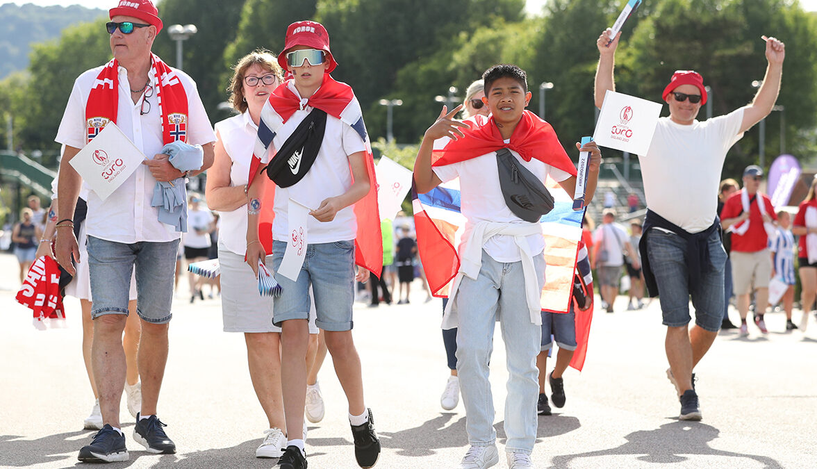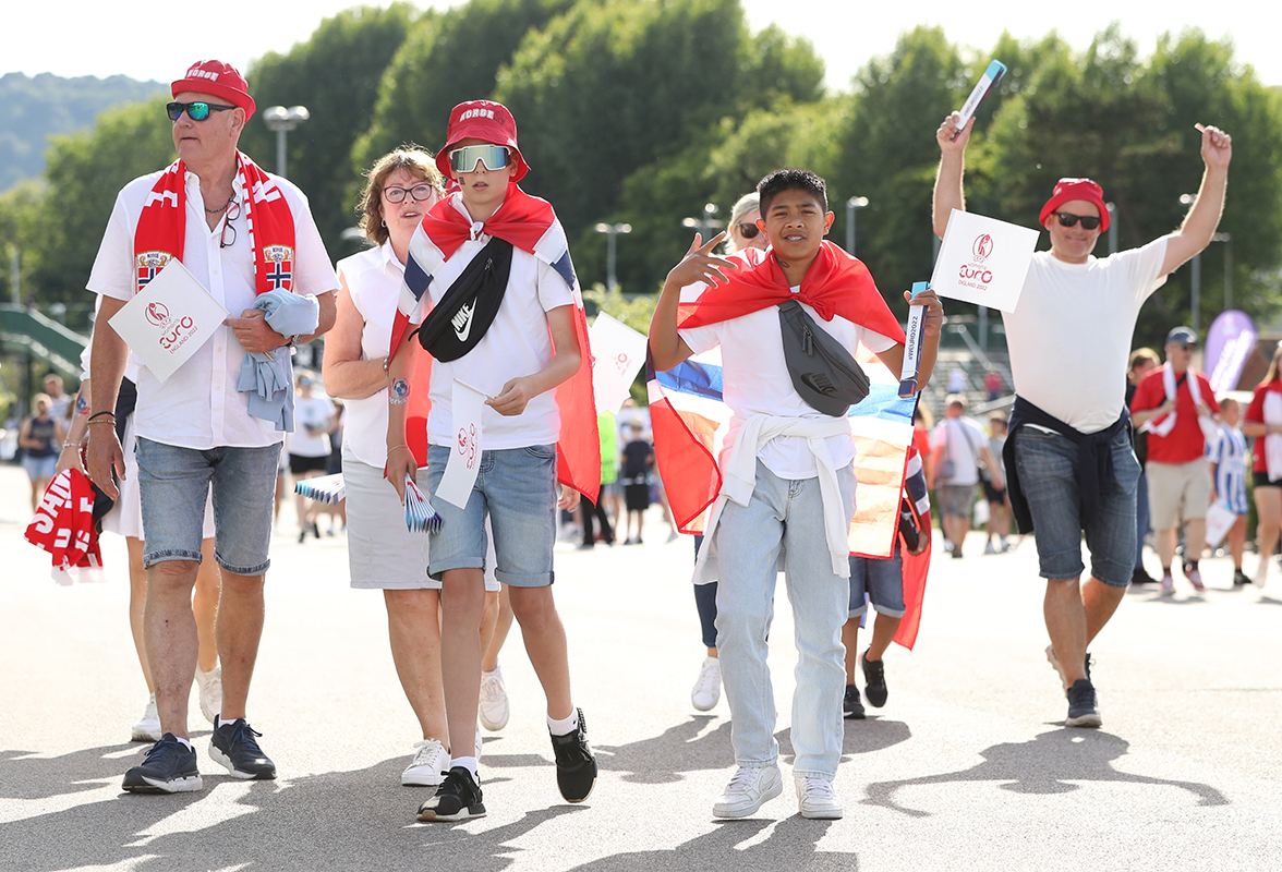 Los aficionados de Noruega llegan antes del partido del Campeonato de Europa Femenino de la UEFA 2022.
