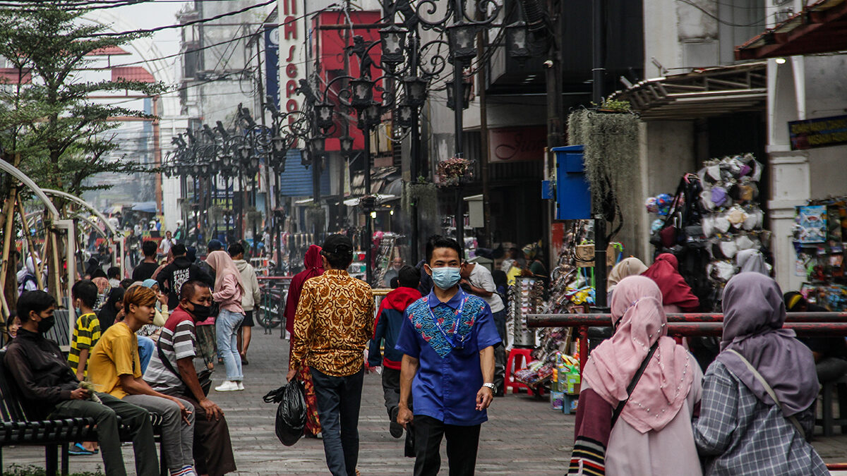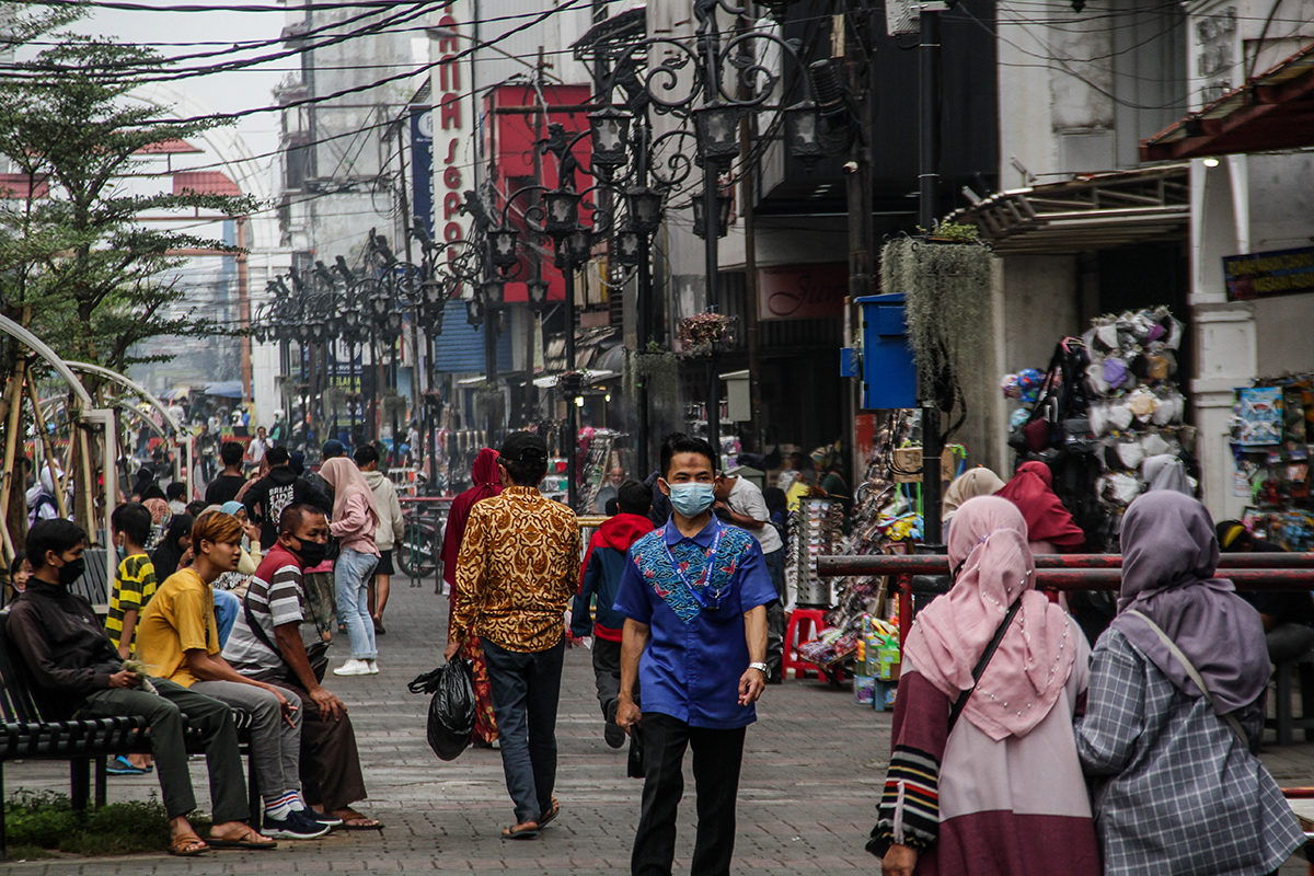 Un hombre con mascarilla caminando en una zona comercial en Bandung. El presidente de Indonesia, Joko Widodo, pidió al población que use máscaras tanto en interiores como en exteriores, esto está relacionado con la creciente propagación del virus Covid-19 en Indonesia.