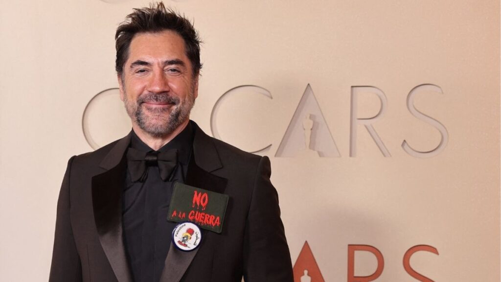 Javier Bardem en los Oscar con un pin de ‘No a la guerra’ y otro en apoyo de Palestina.