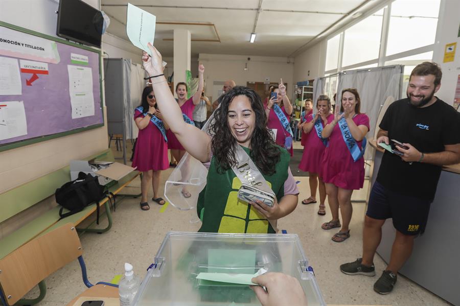 Una joven con velo y disfrazada para celebrar su despedida de soltera se dispone a introducir su papeleta de voto en una urna del IES La Caleta en el barrio de La Viña en Cádiz.