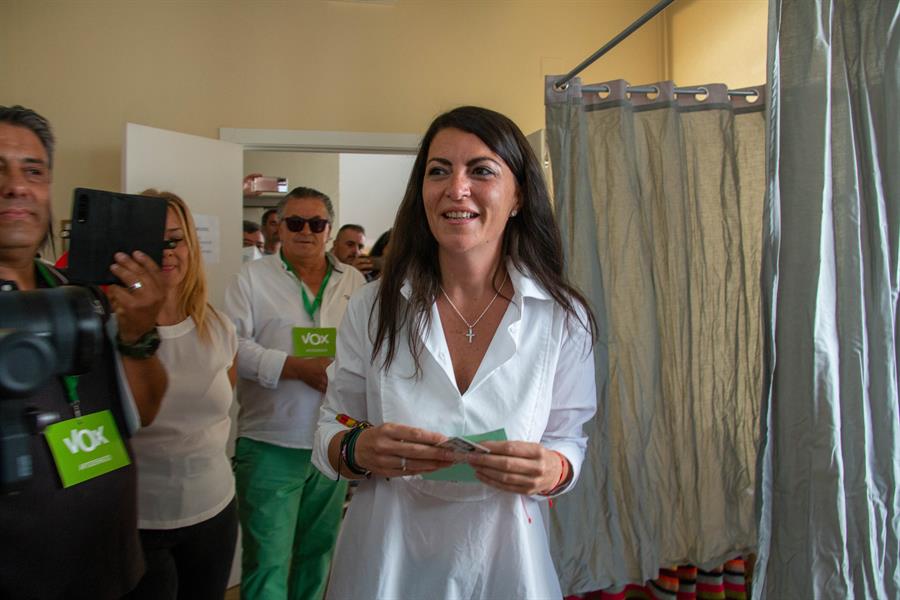 La candidata de Por Andalucía, Inmaculada Nieto, introduce el sobre con su papeleta en el colegio electoral de la Huerta de la Cruz en Algeciras (Cádiz).