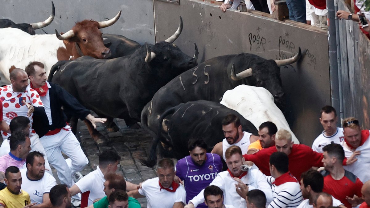 Dos de los toros tropiezan a la salida del segundo encierro de los Sanfermines, rozando con el muro de protección.