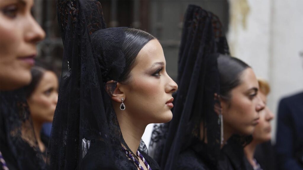 Mantillas de la hermandad de la Agonía acompañan la procesión del Cristo de la Agonía durante el recorrido que ha realizado martes por las calles de Córdoba