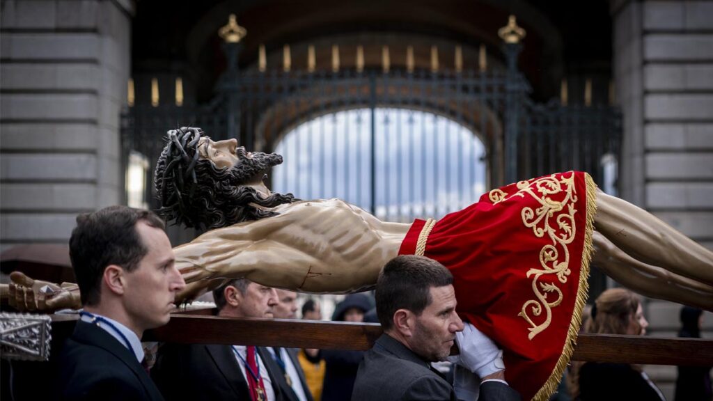 Miembros de la Real Cofradía del Santísimo Cristo de la Fe «Cristo de los Alabarderos» portan la imagen del Cristo a hombros durante la Procesión del Traslado del Cristo de los Alabarderos desde la Catedral Castrense hasta el Palacio Real en Madrid
